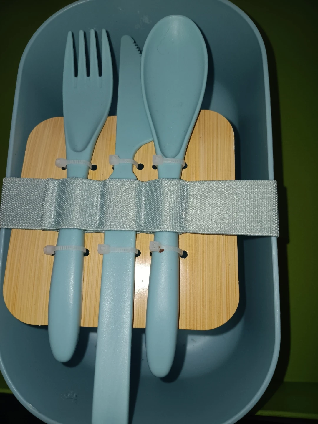 This utensil set includes a fork, knife, and spoon in a light blue color. The set comes with a reusable case. Perfect for on-the-go meals!