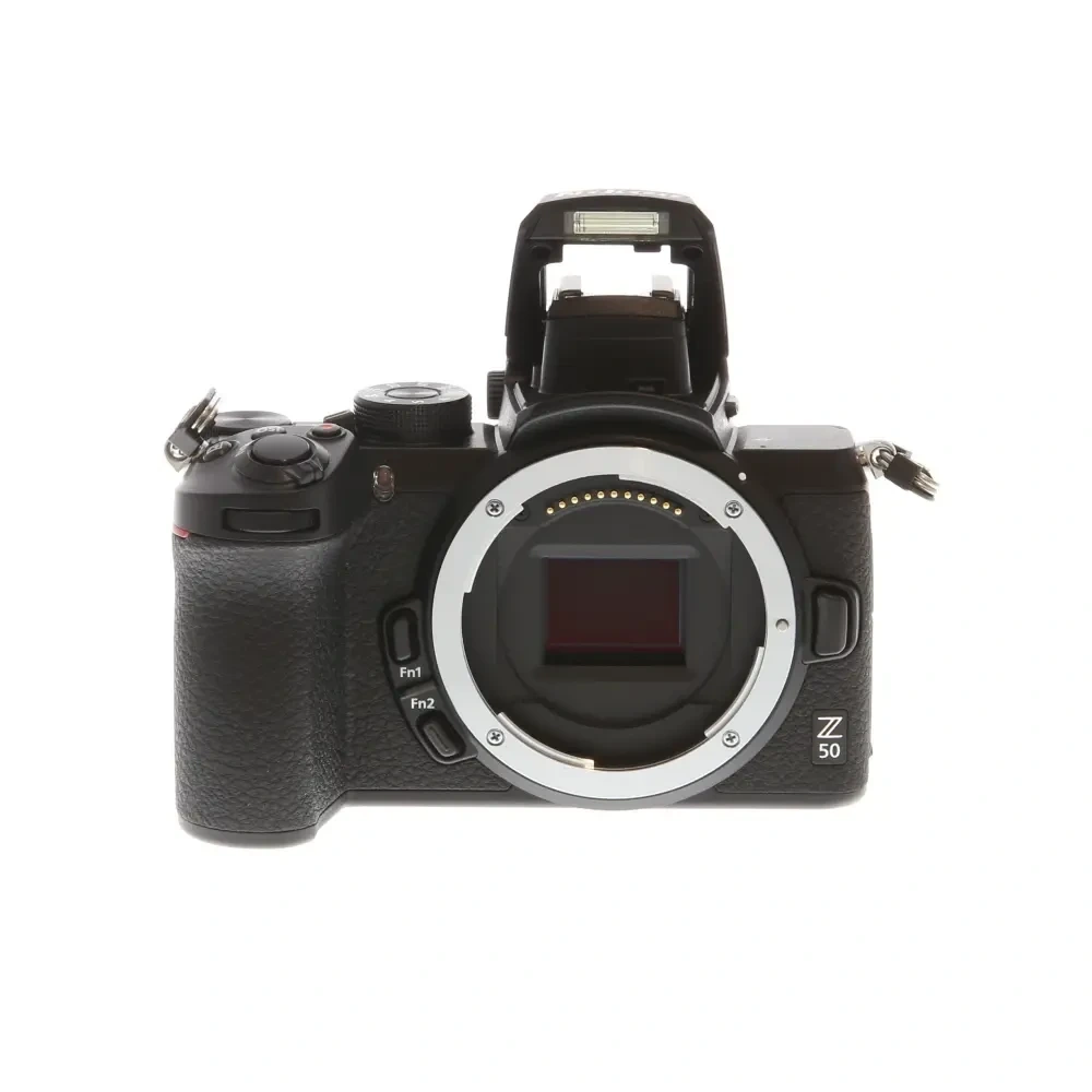 This is a black Nikon Z 50 mirrorless digital camera. It features a pop-up flash and a lens mount. Great for capturing high-quality photos and videos!