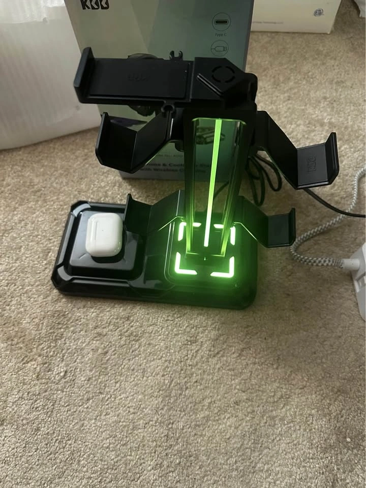 Brand new RGB headphone and controller stand with wireless charging. Features 9 RGB light modes, a rotatable headset stand, and holders for controllers.