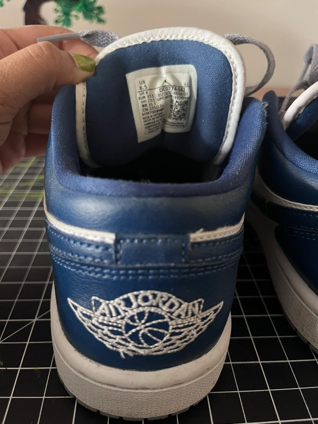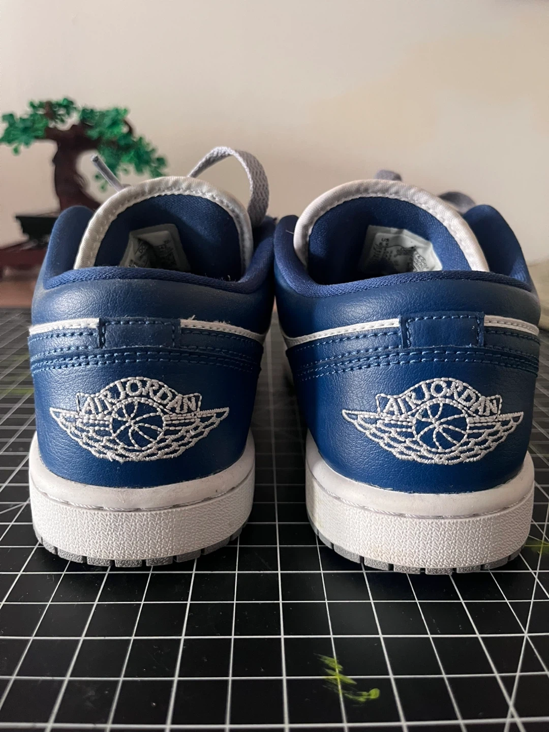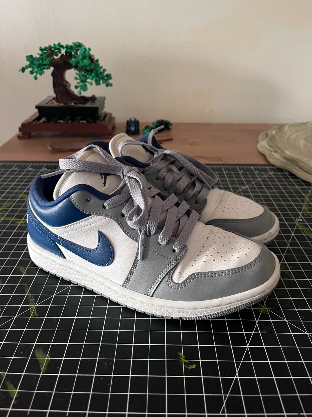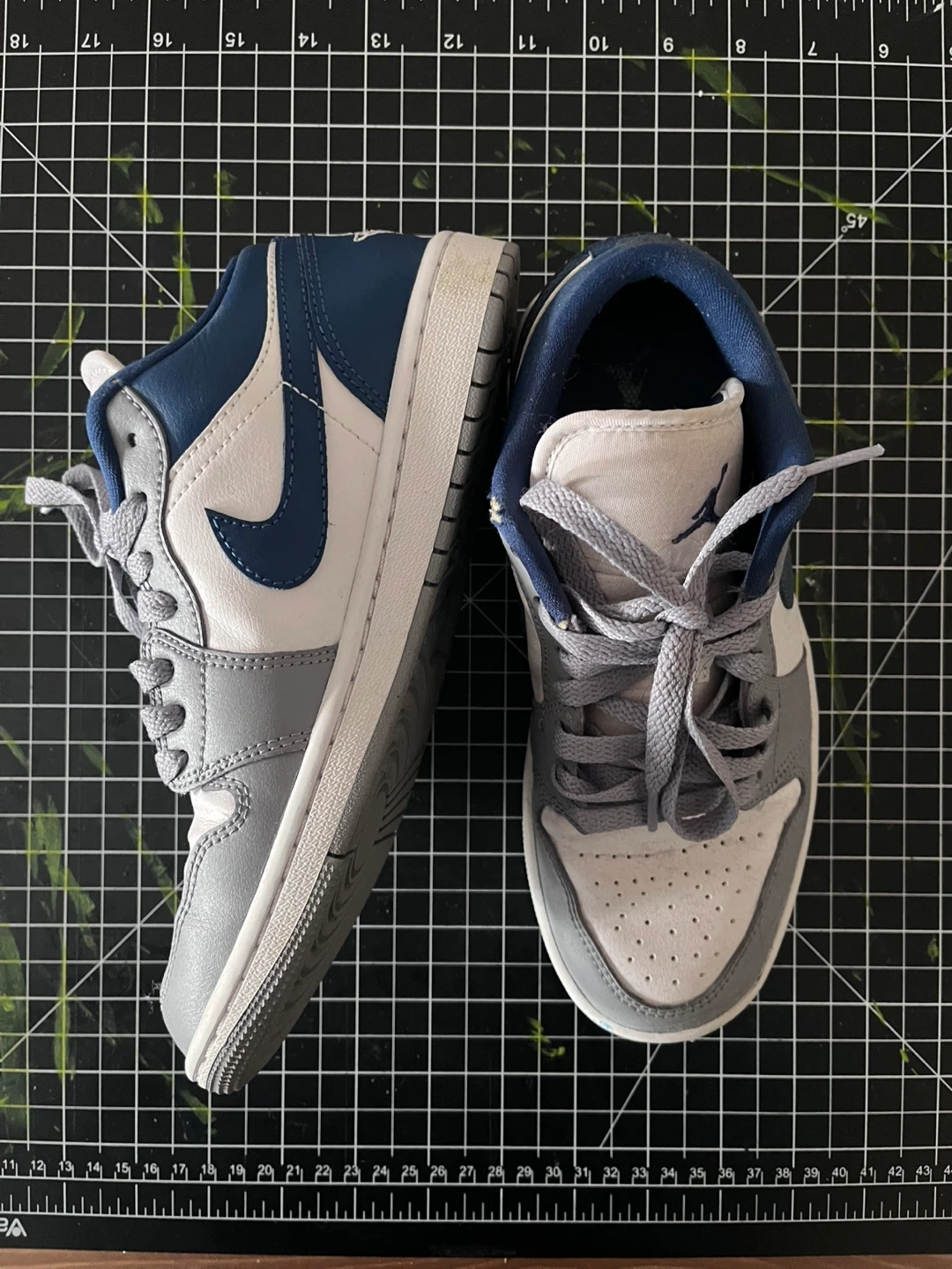 These Air Jordan 1 Low SE sneakers feature a clean white, grey, and dark concord blue colorway. They include a durable rubber outsole and comfortable cushioning. They're perfect for everyday wear! Barely worn but do have some wear and tear.