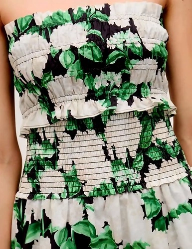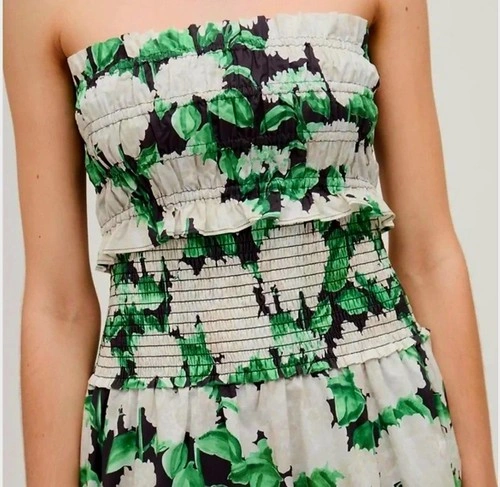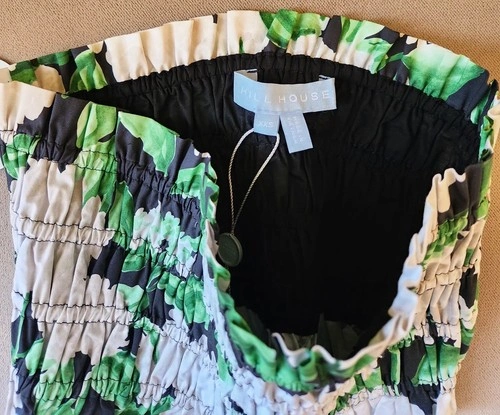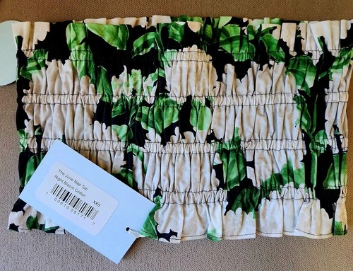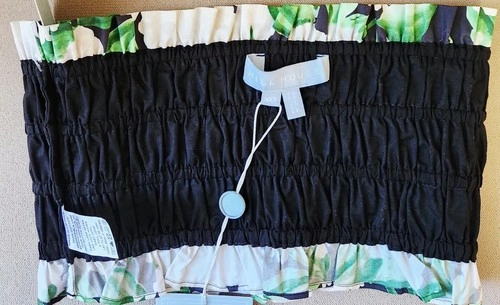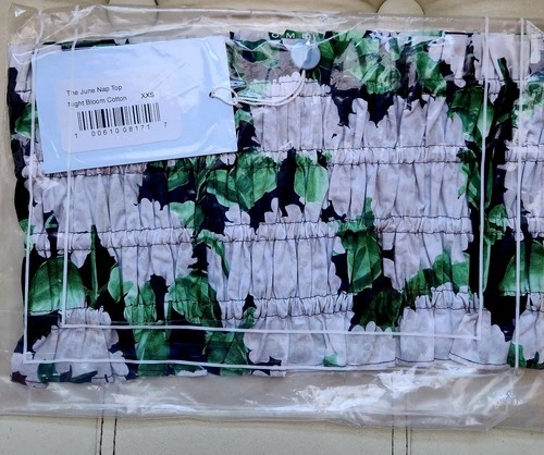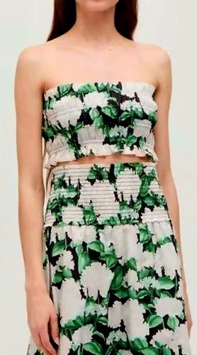 Summer Chic. Delicate ruffled hem adds a soft, romantic touch. Strapless bandeau design is perfect for layering or warm weather wear. Cropped length is ideal for pairing with high-waisted skirts or pants. Vibrant Night Bloom print features bold white florals and lush green leaves. 100% lightweight cotton is breathable and easy to wear. Pull-on style with no zippers or closures for a clean, effortless look. Brand: Hill House. Style: The June Nap Top. Print: Night Bloom (white hydrangeas & green leaves on black and white). Size: XXS. Material: 100% Cotton. Made in: Vietnam. Condition: Brand New with Tags (NWT). Model photo (top only – skirt not included) for styling reference.