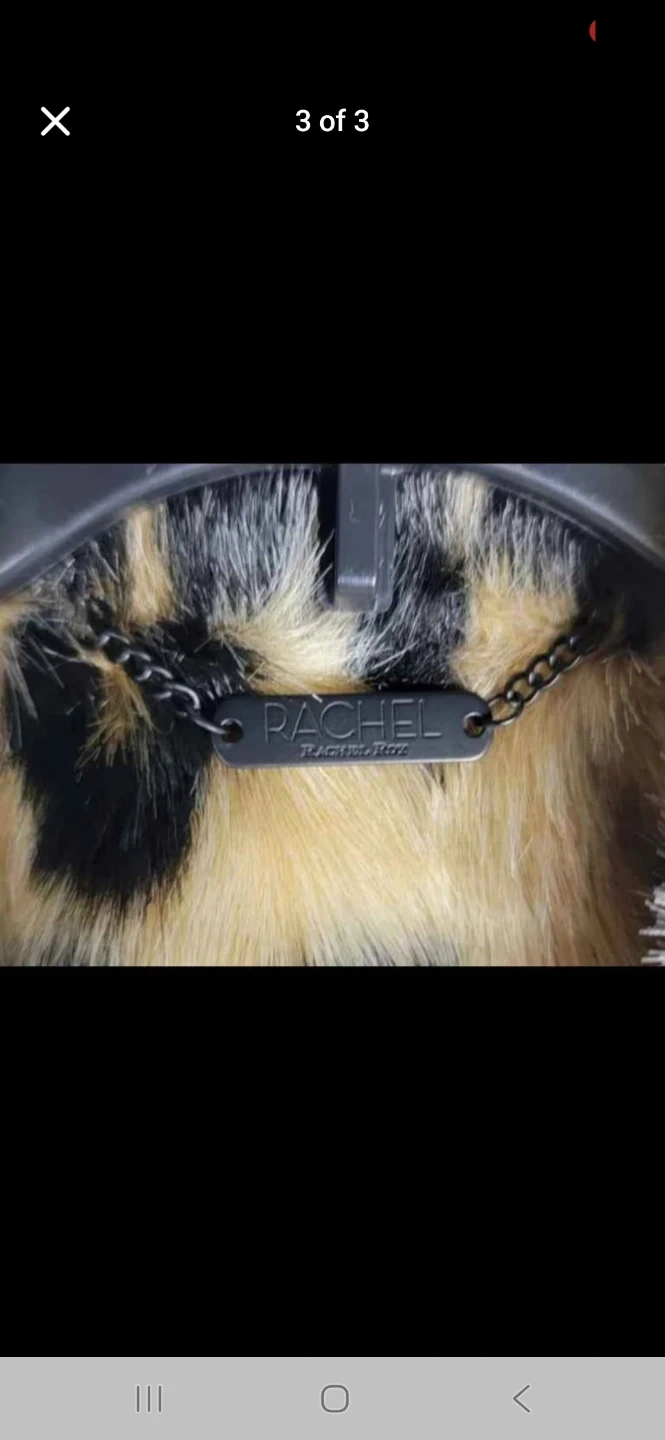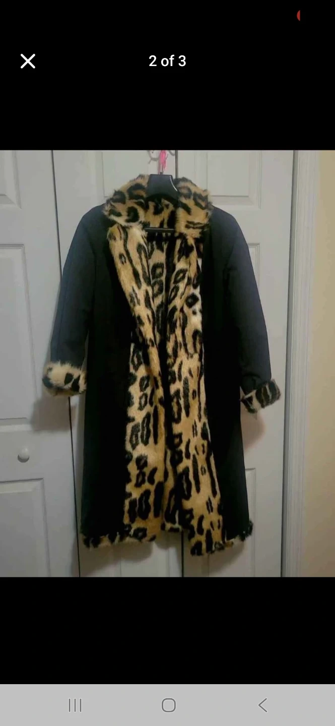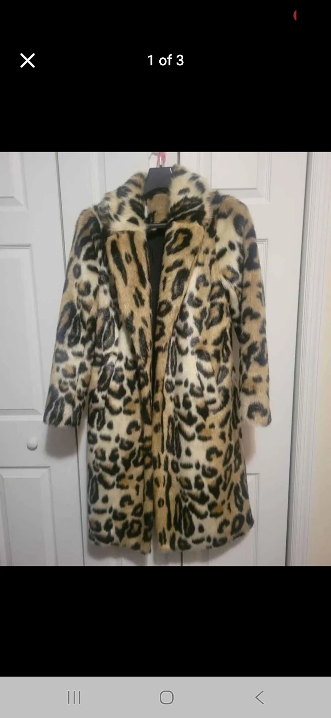 This is a Rache roy l brand faux fur coat with a leopard print. It's a stylish piece for cooler weather. The lining is black.