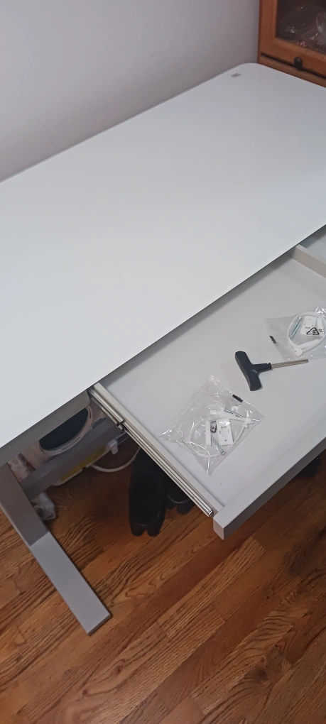 Selling a white standing desk! It's in great condition and ready for a new home. It has adjustable height settings, so you can sit or stand while you work. Includes a drawer for storage and some accessories.