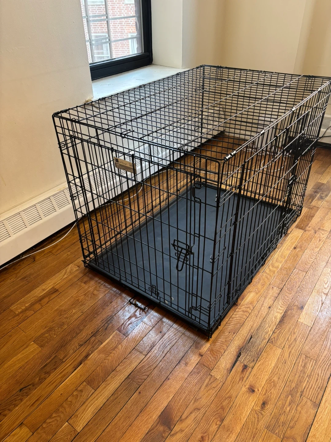 Medium size dog cage. Leak proof plastic pan for easy cleaning and two secure slide bolt latches. This cage is ideal for training and containment.