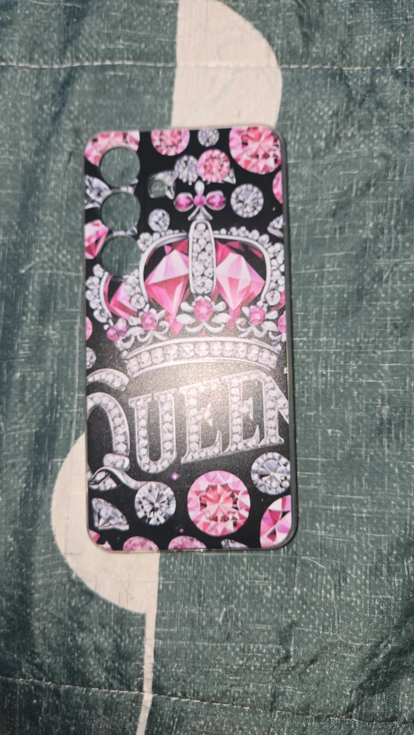 This phone case features a black background with a sparkly crown and the word "Queen" embellished with diamonds. It also has pink and clear diamond accents all over. It offers a decorative design for your phone. Samsung Galaxy S24 case