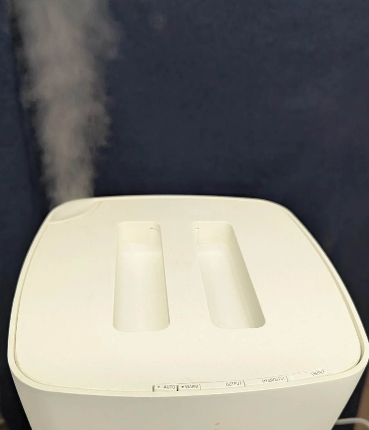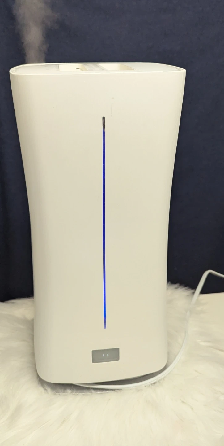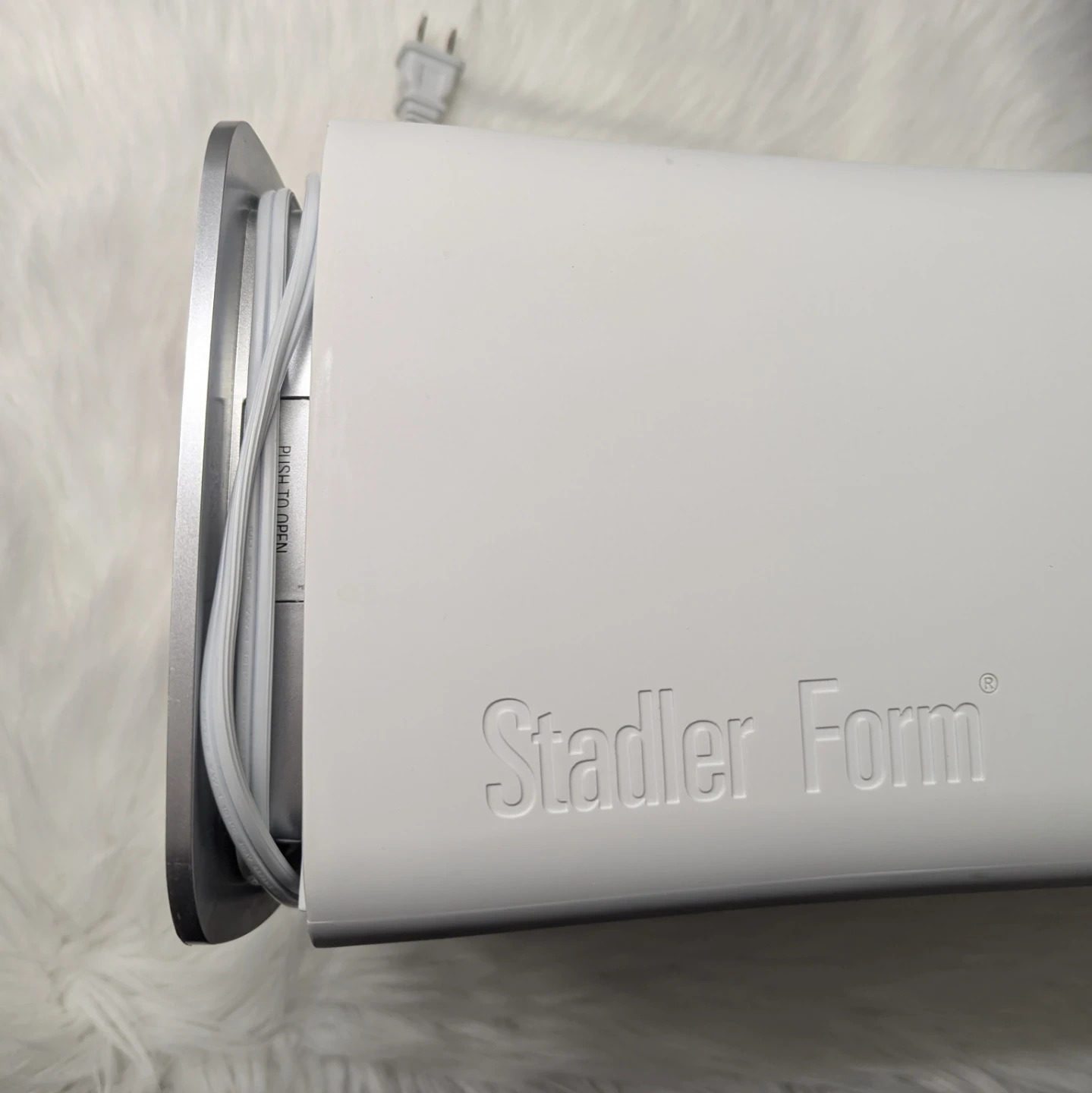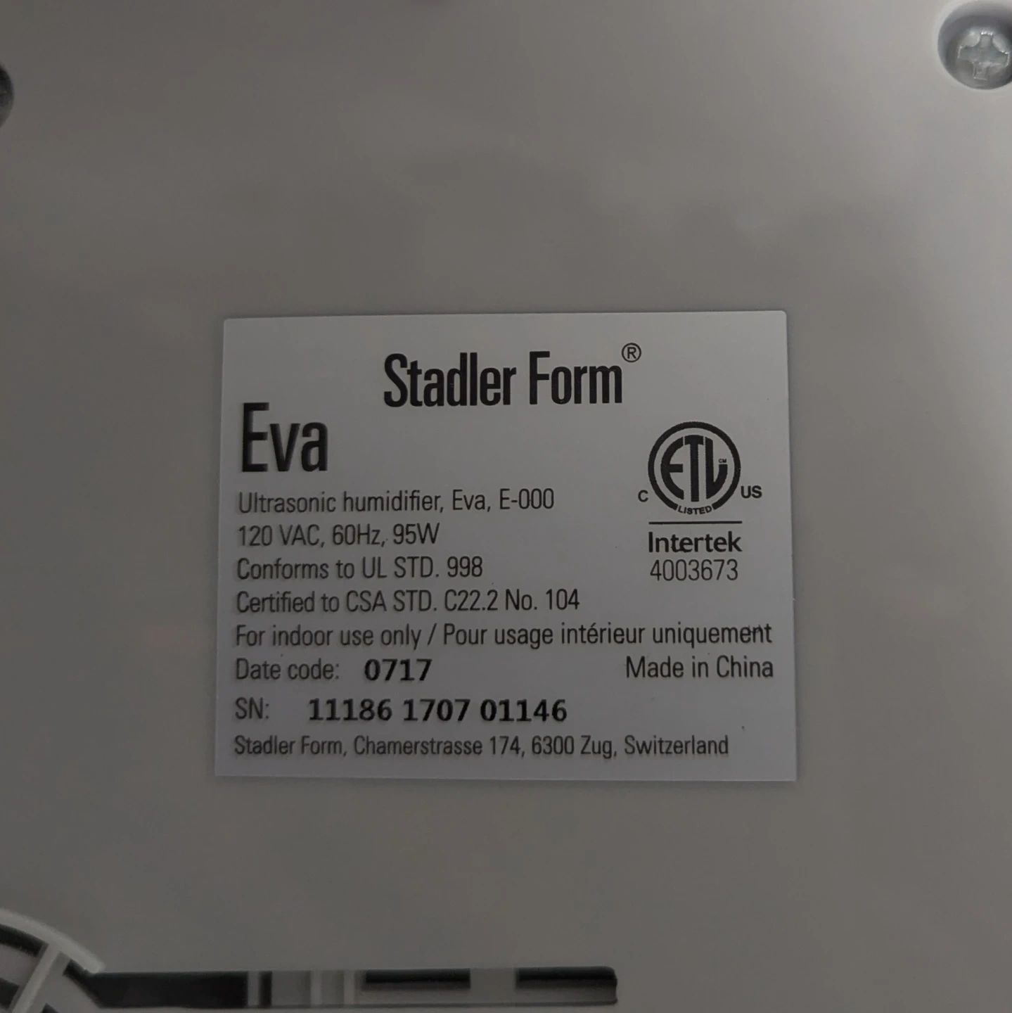 This Stadler Form Eva ultrasonic humidifier is white. It's an E-000 model. 120 VAC, 60Hz, 95W. Certified to CSA STD. C22.2 No. 104. For indoor use only.