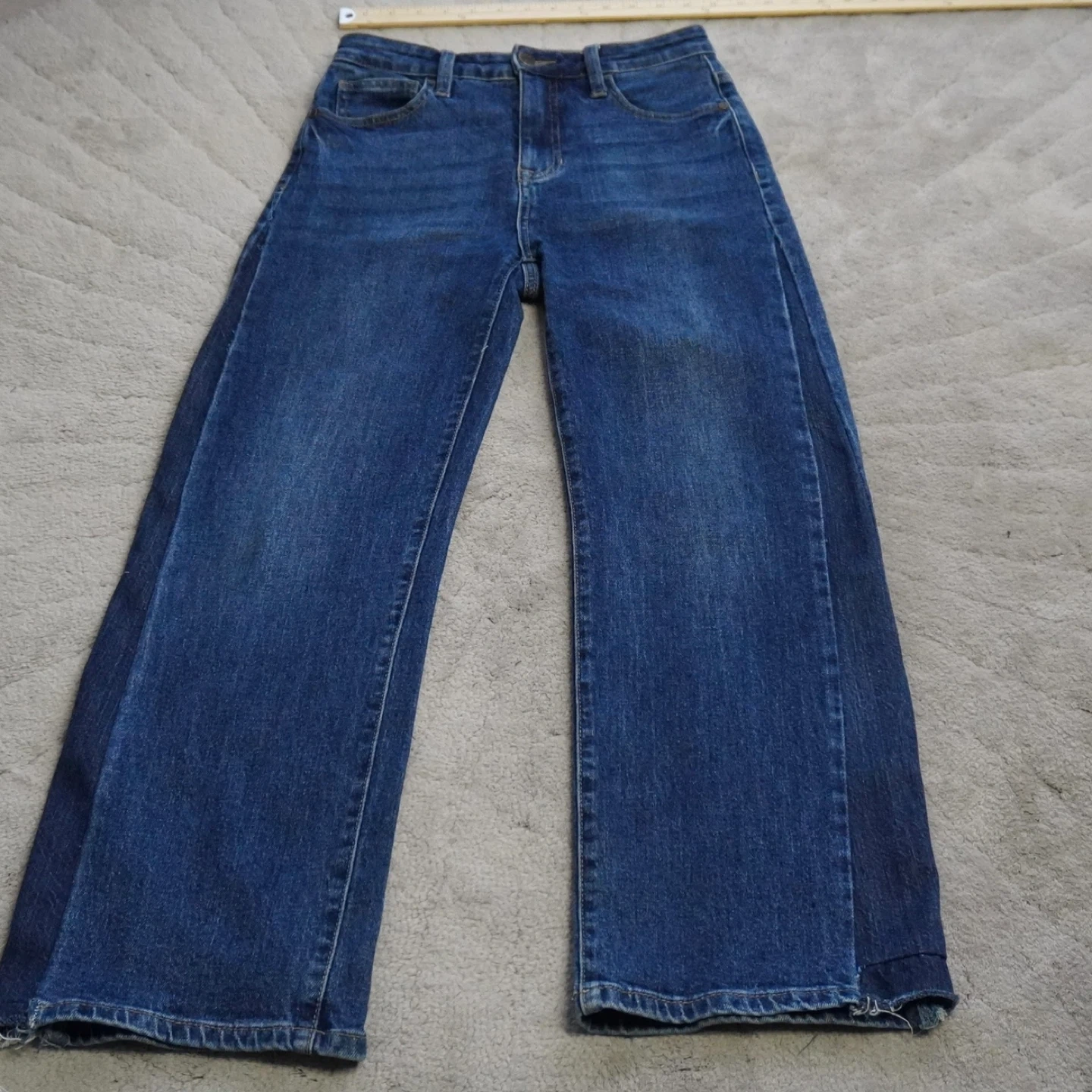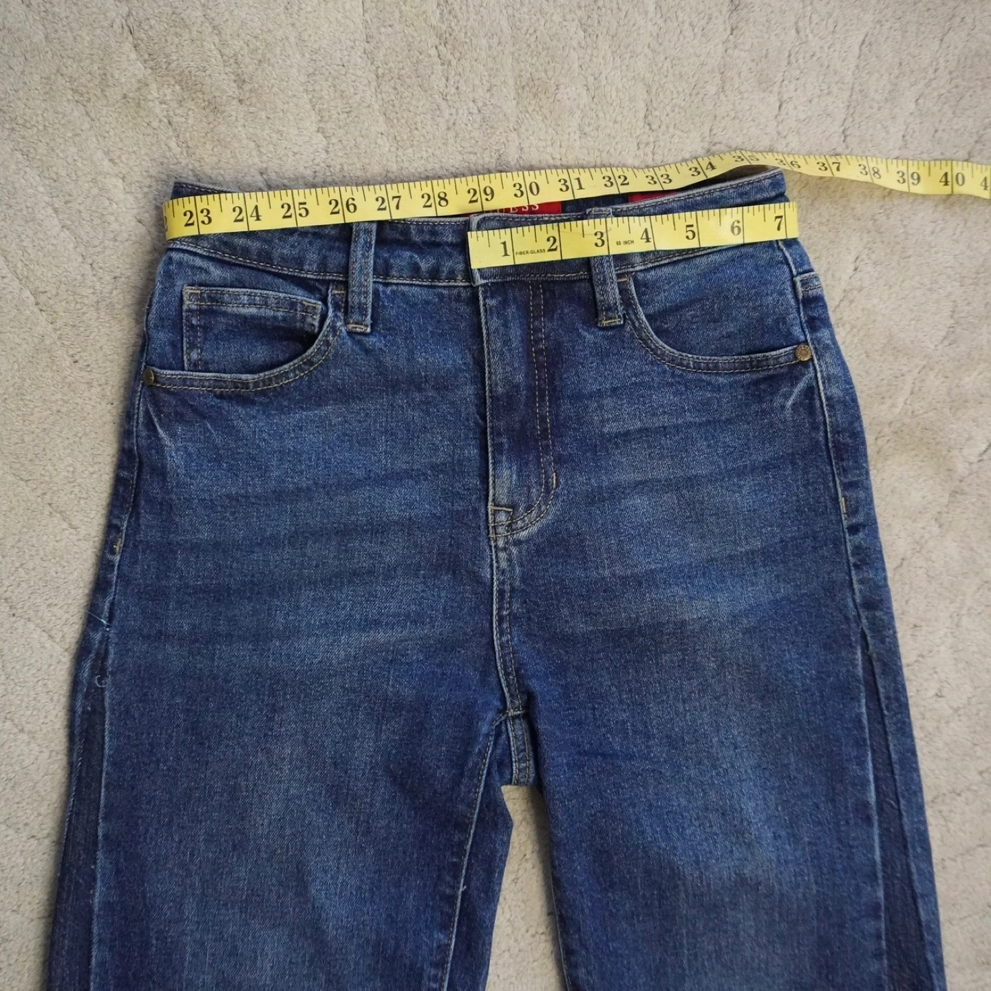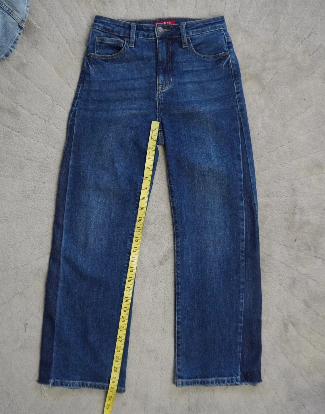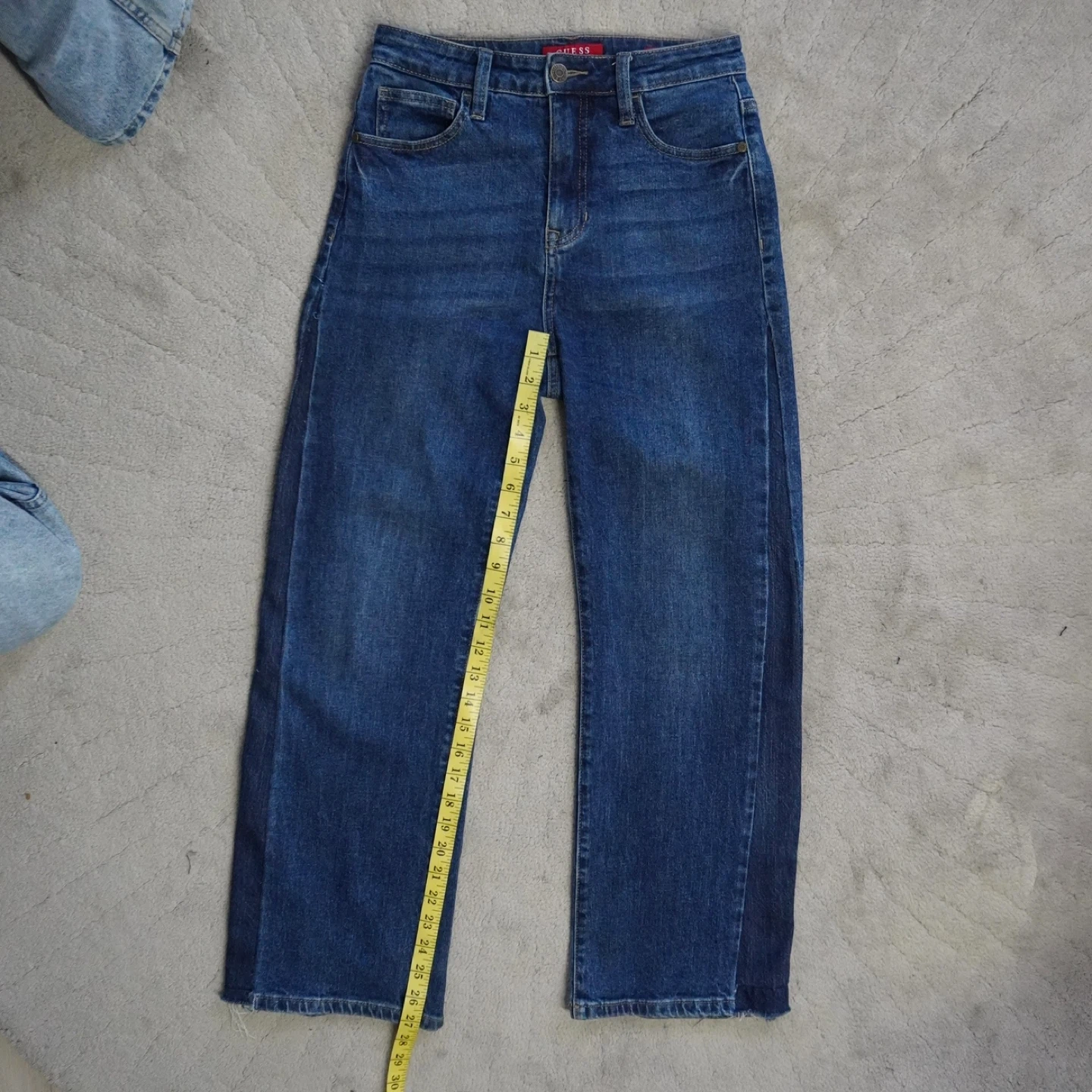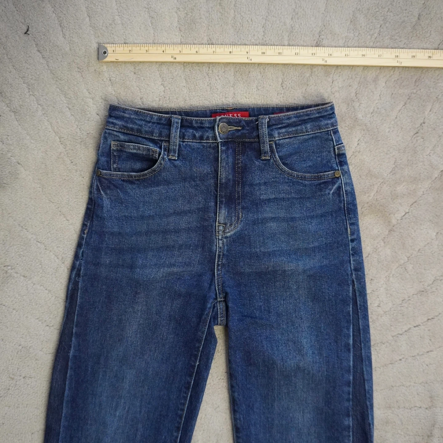 Guess denim jeans in a classic blue wash. These are an ultra high rise straight leg style. Waist measures approximately 29 inches. They fit like a 26