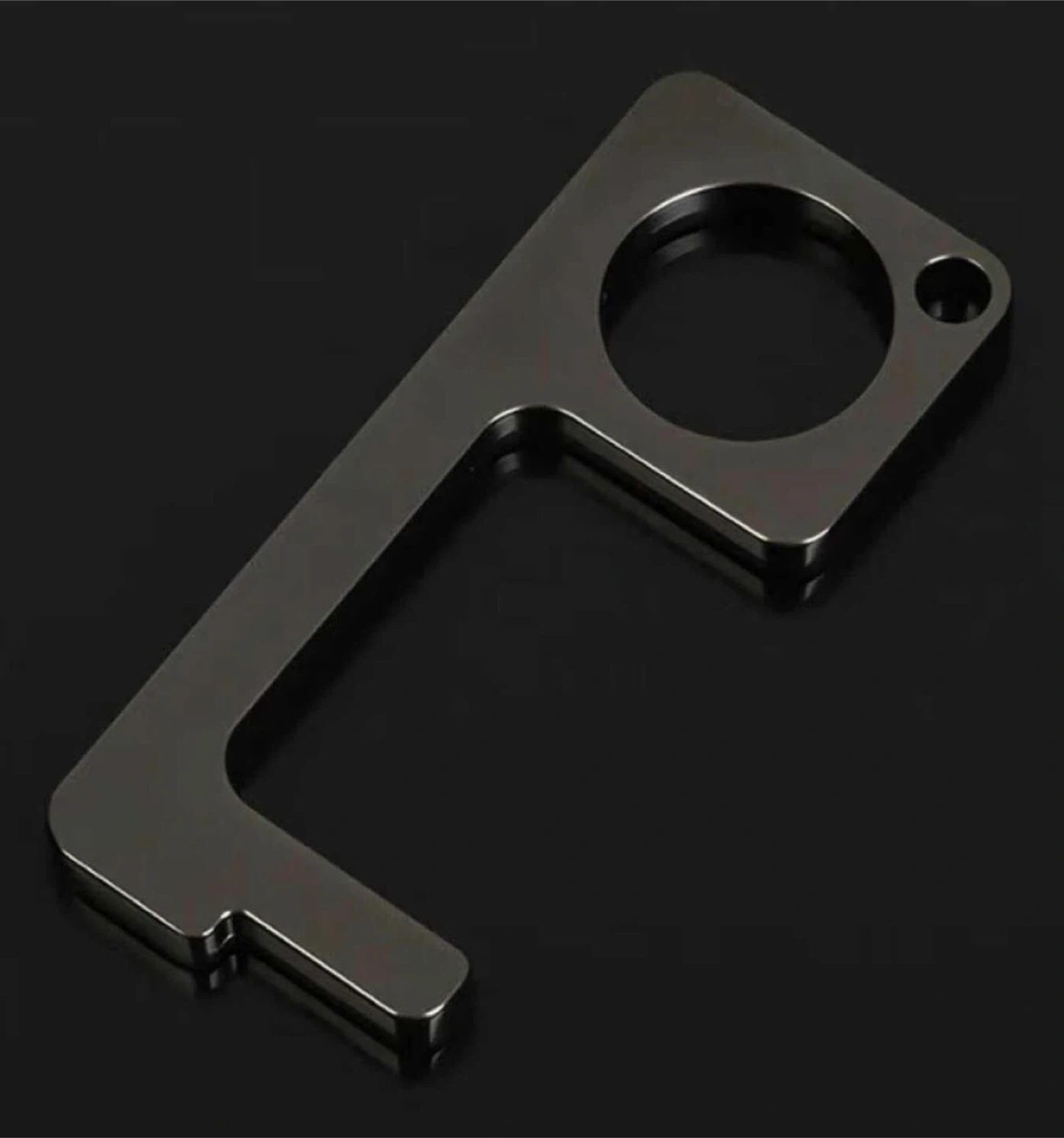 This is a handy contactless tool. It's made of metal and features a hole for easy carrying. You can use it to open doors and press buttons without direct contact.