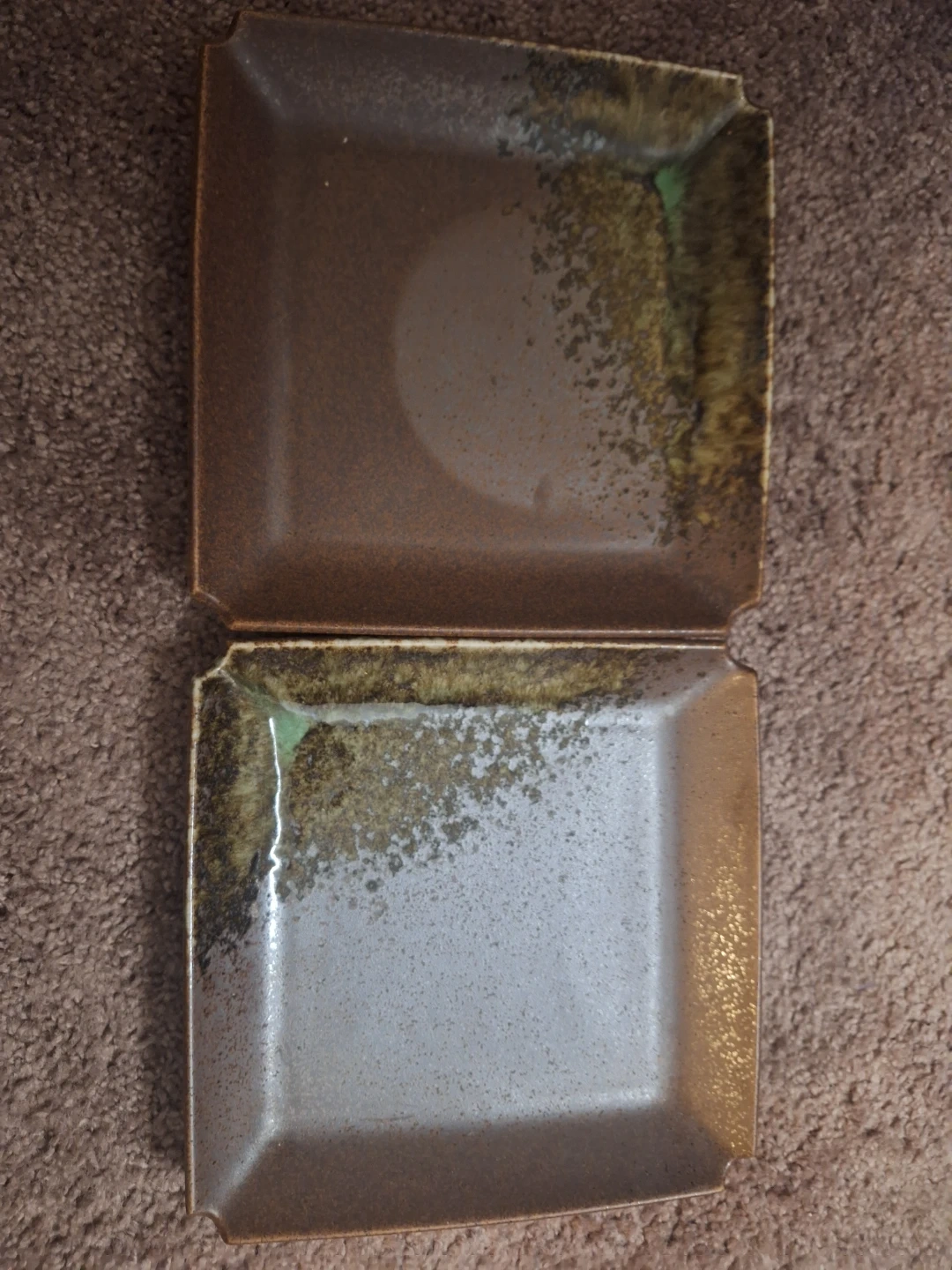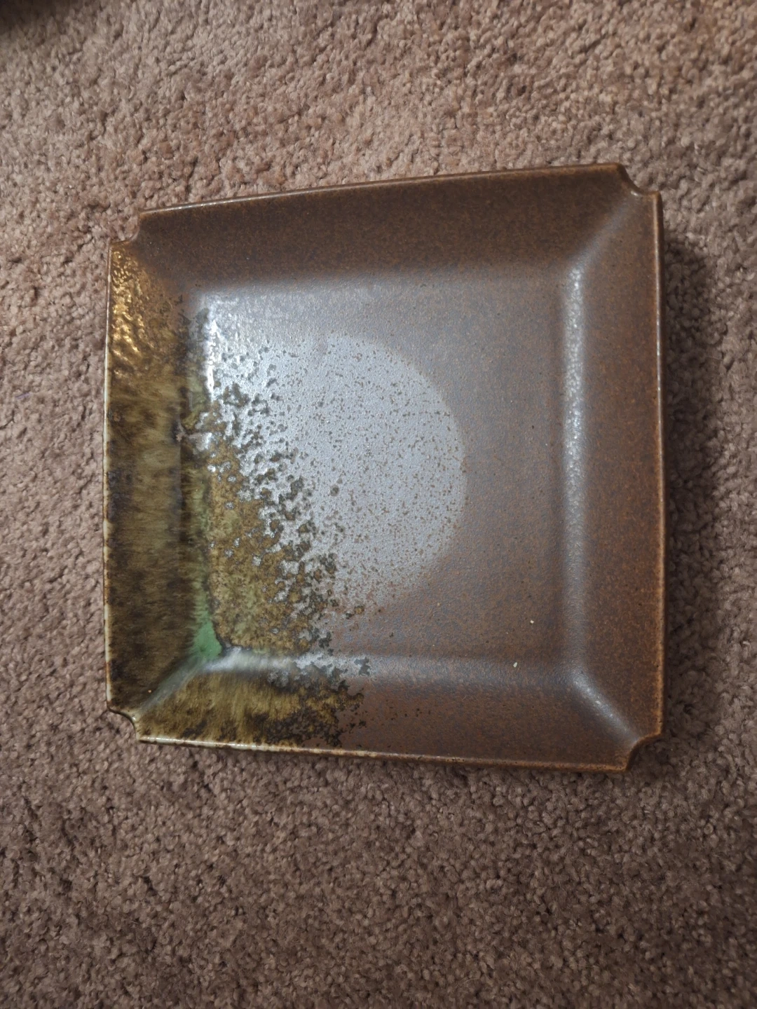 Selling a set of two square ceramic plates. They have a unique glaze with brown, grey, and hints of green. Perfect for adding a touch of rustic charm to your table setting!pick up only