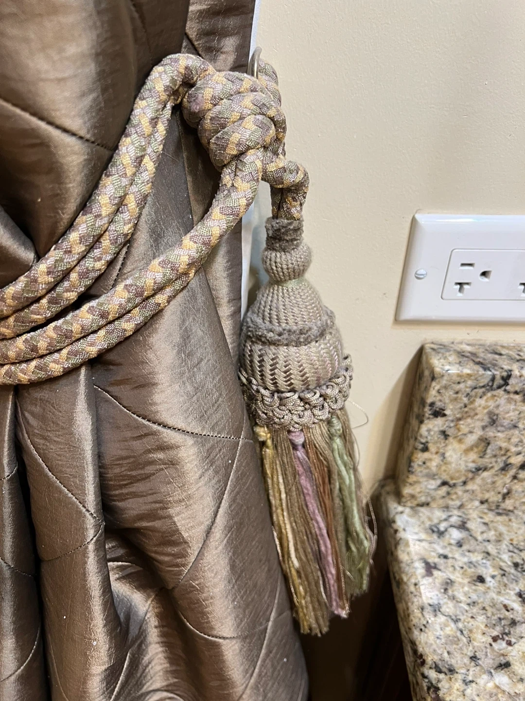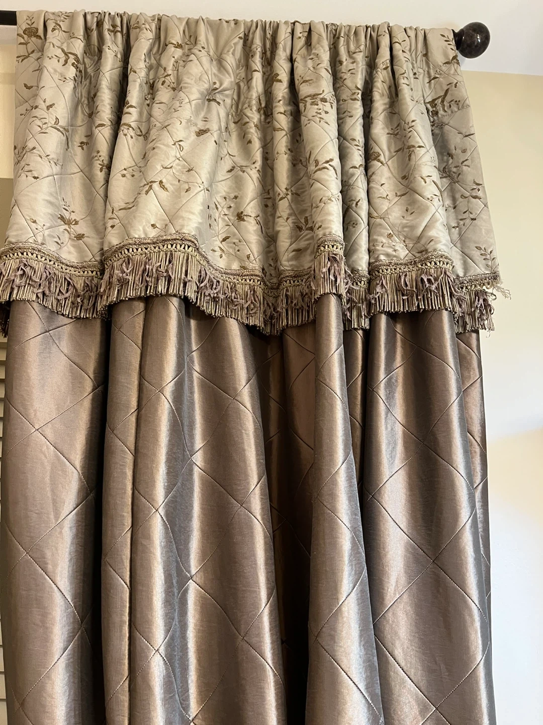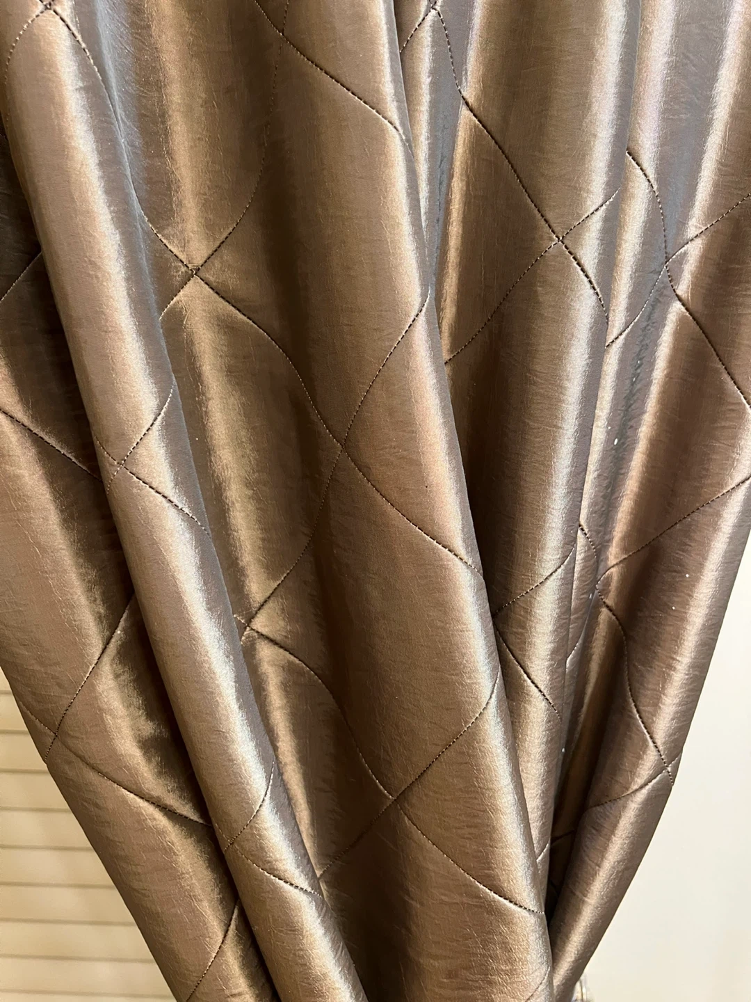 Elegant satin curtains featuring a diamond quilting pattern. Comes with decorative tasseled tie-backs. Window treatment adds a touch of sophistication to any room!