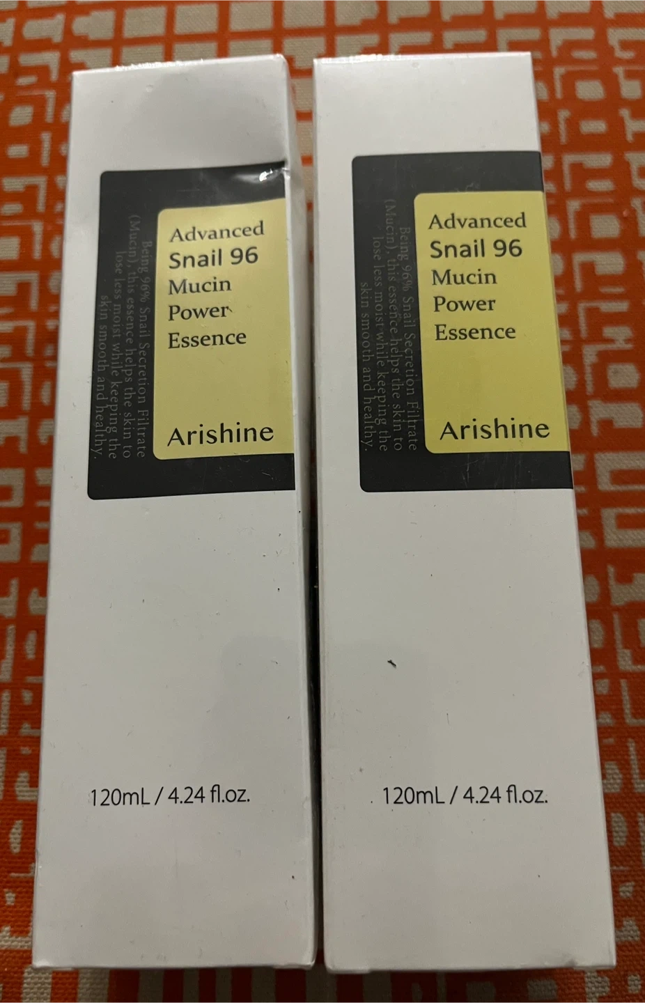 Two bottles of Arishine Advanced Snail 96 Mucin Power Essence. Each bottle contains 120mL. Expiry date is March 26, 2027. Ingredients include snail secretion filtrate, glycerin, and panthenol. This essence helps protect skin from moisture loss, keeping it smooth and healthy. It's great for daily use!