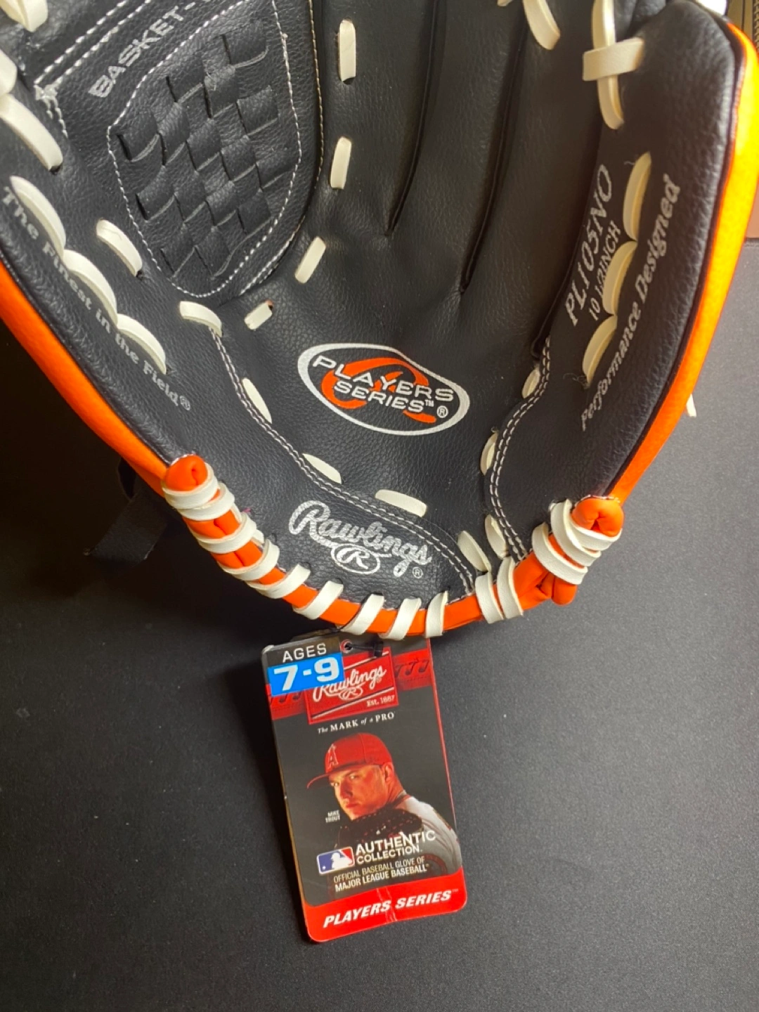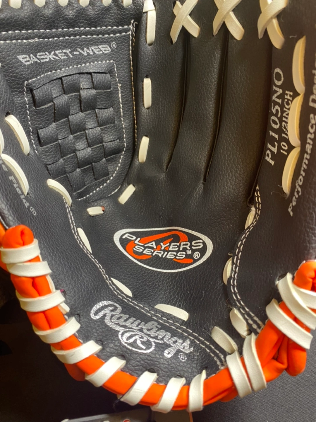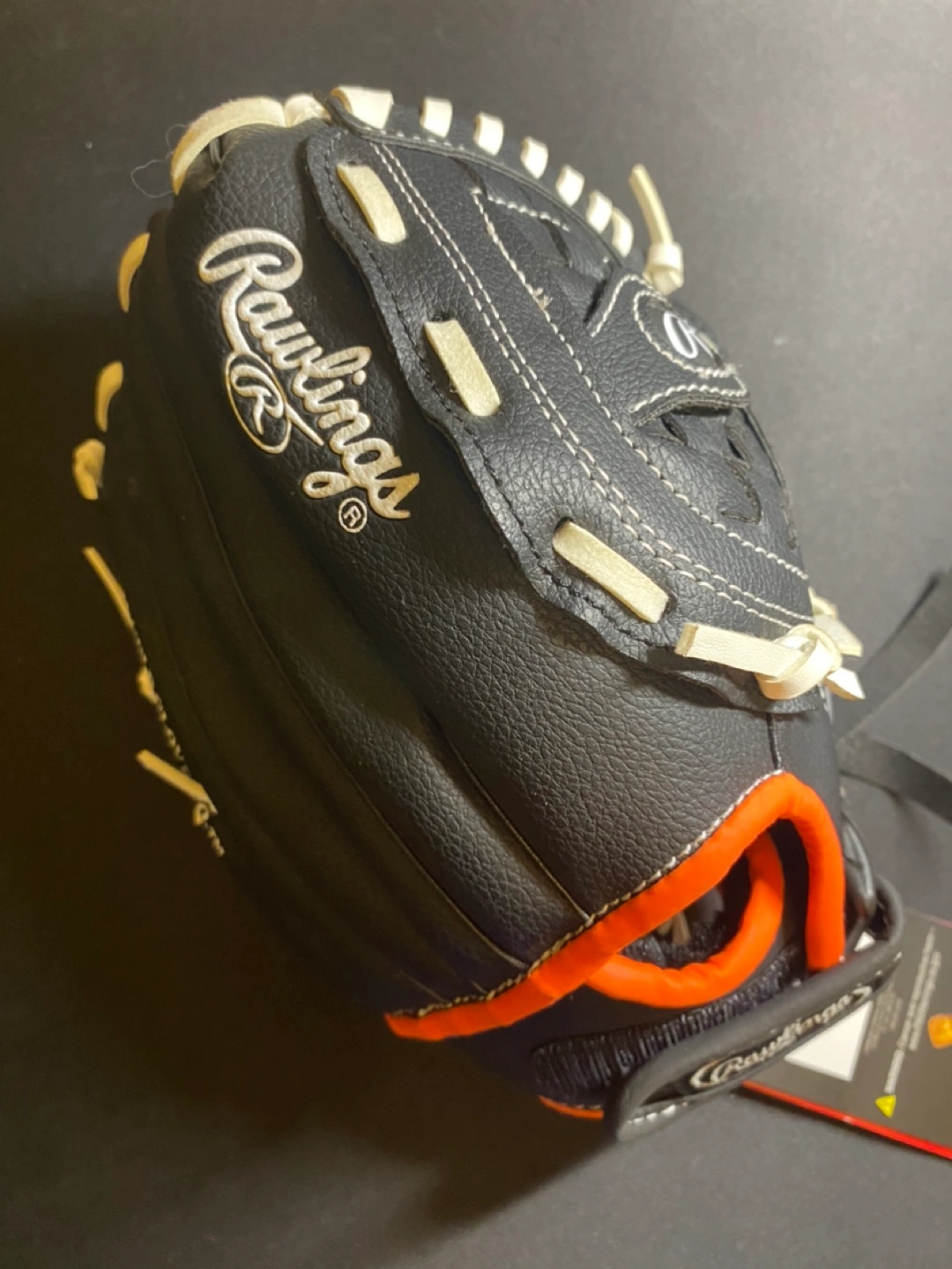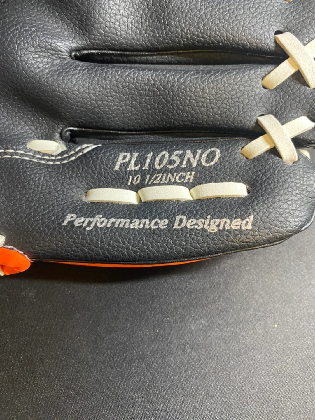 Youth baseball glove. Black and orange. 10 inch. Basket-web. Ages 7-9. Performance designed.