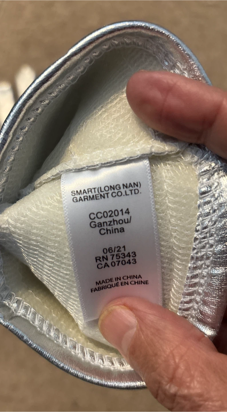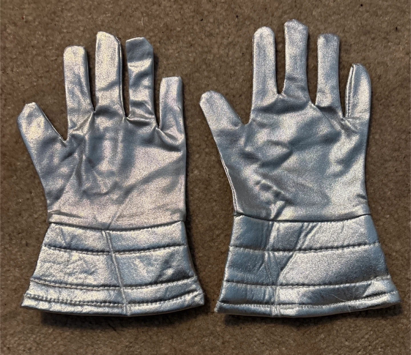These silver metallic gloves have a shiny finish. They're made from a synthetic material. Great for costumes or dress-up!