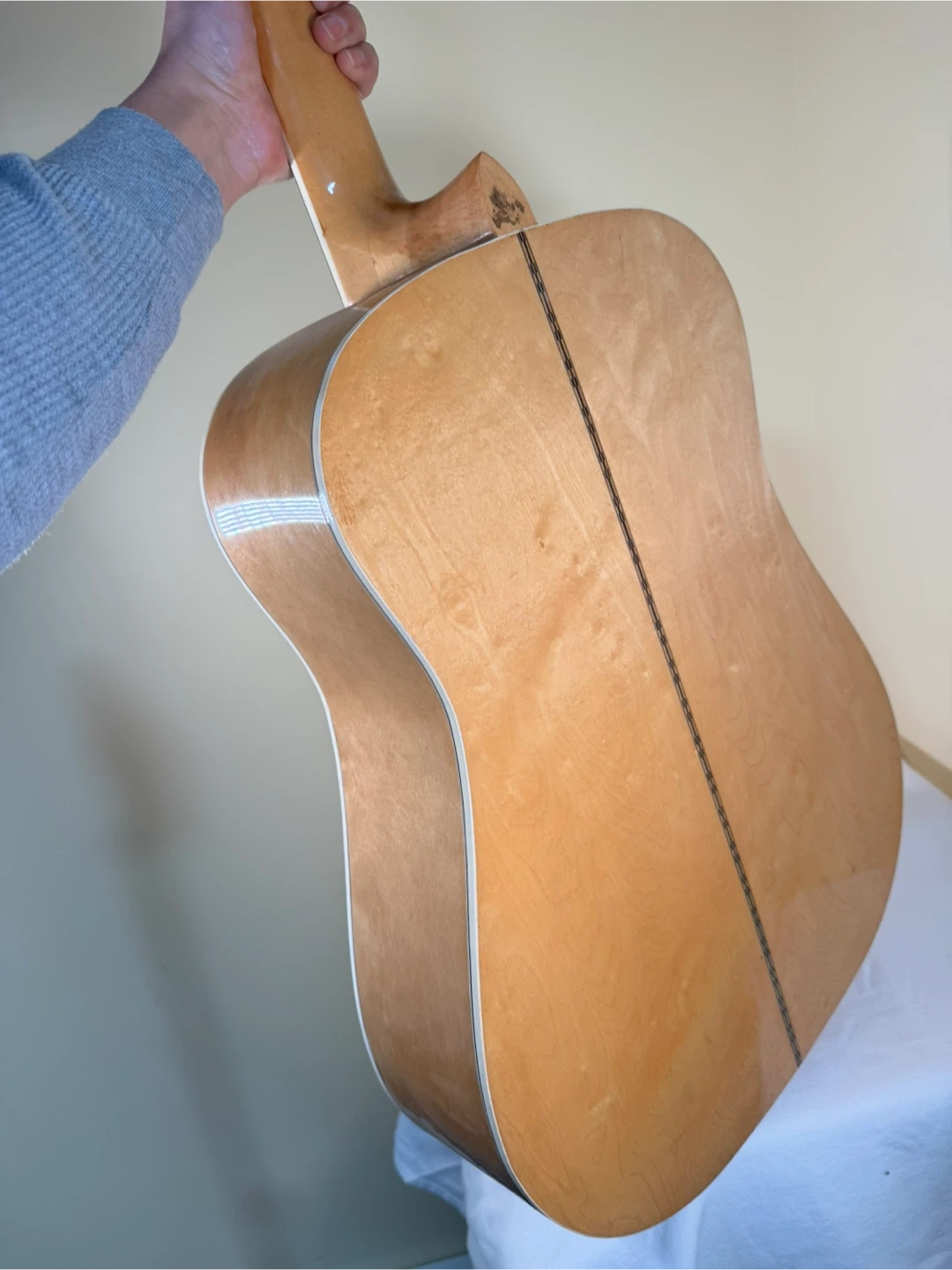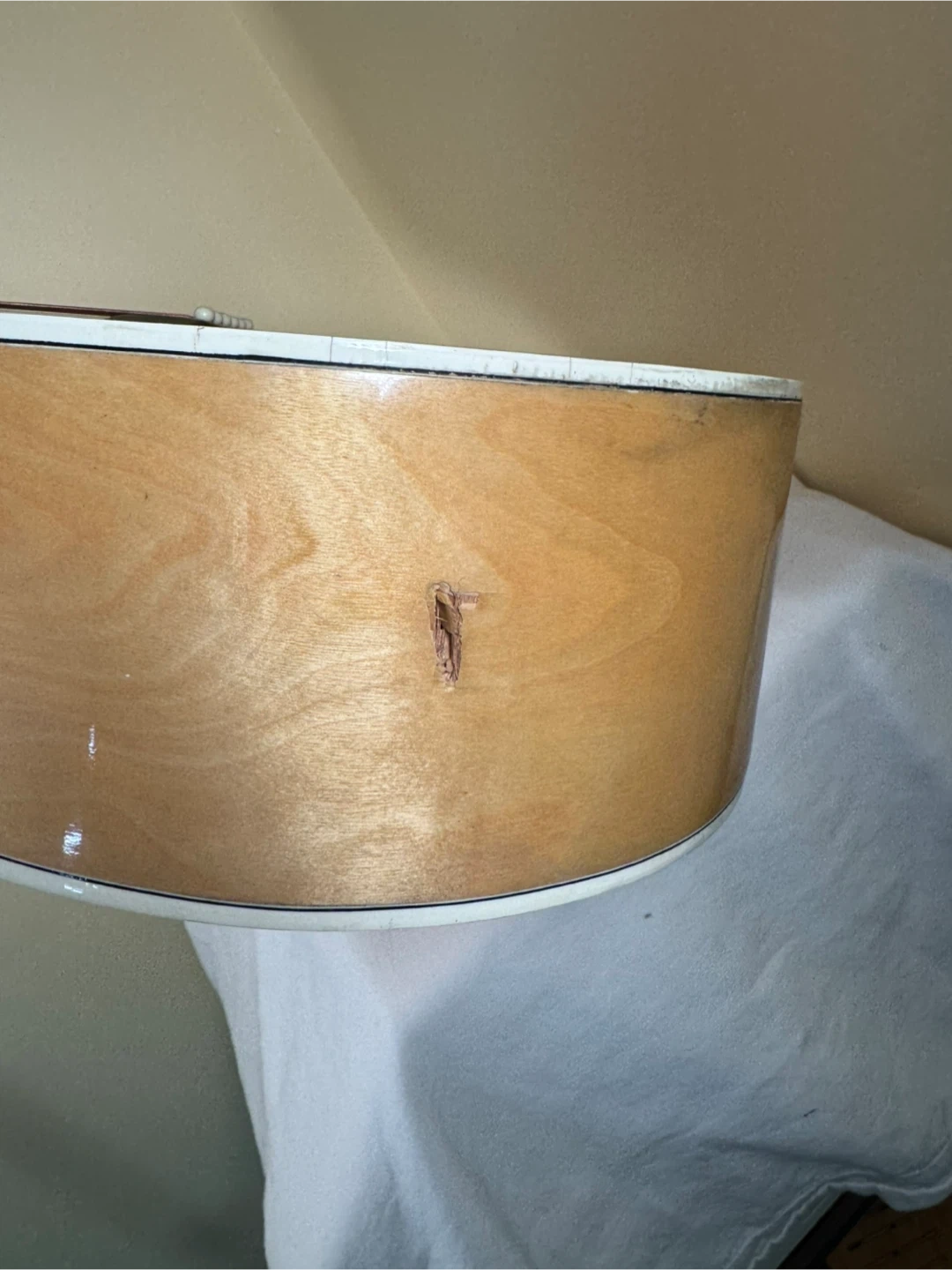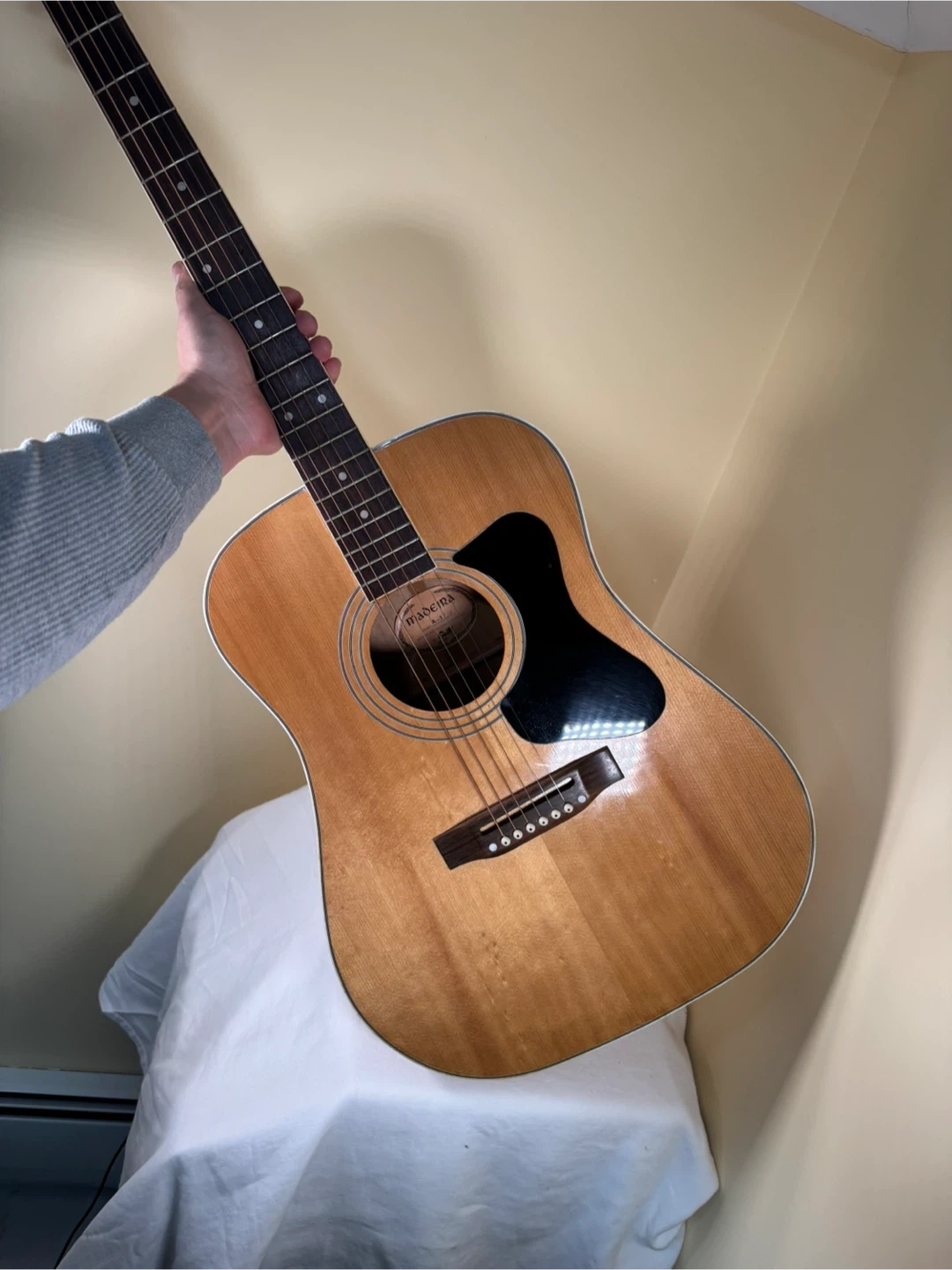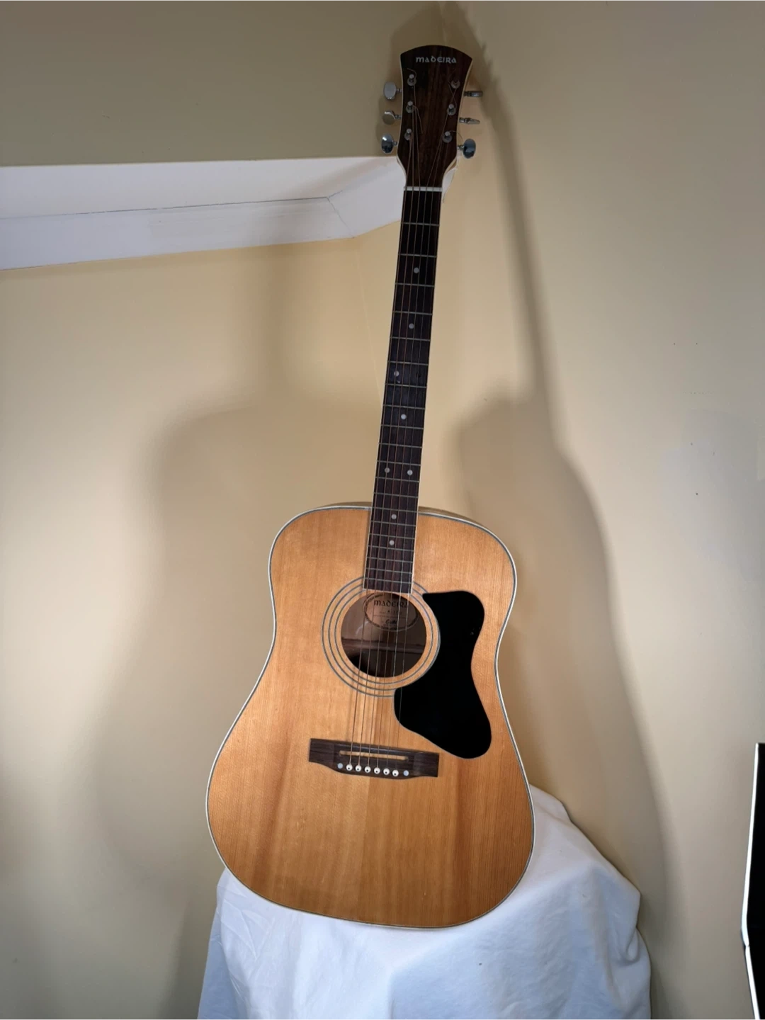 This is a Madeira acoustic guitar with a natural wood finish. It has a pickguard and six strings. There's a noticeable dent on the side of the body. It's ready for a new home!