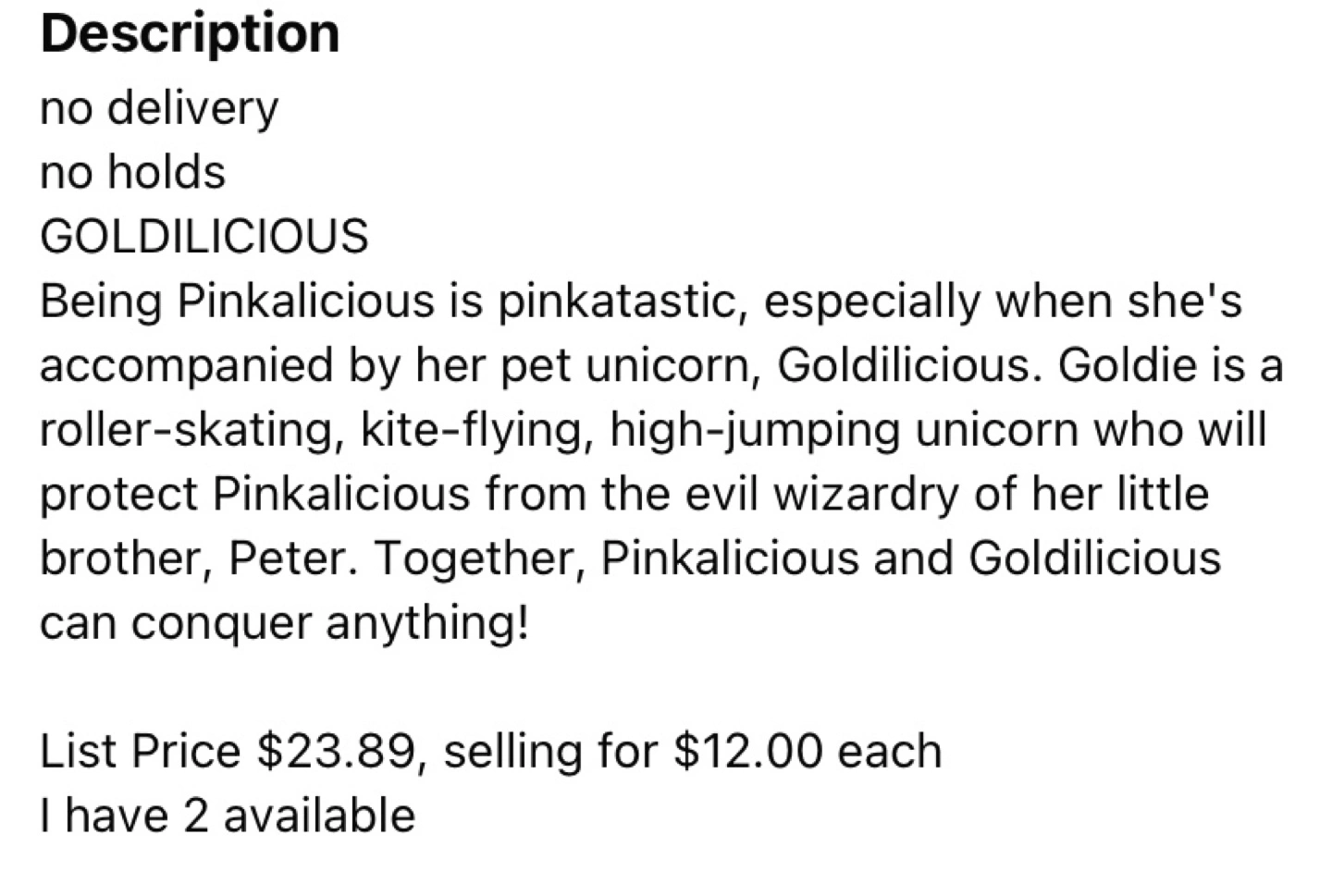 Pre-loved children's book. Great condition. No delivery, no holds. $12.00 each. Two available. Pinkalicious and Goldilicious adventures.