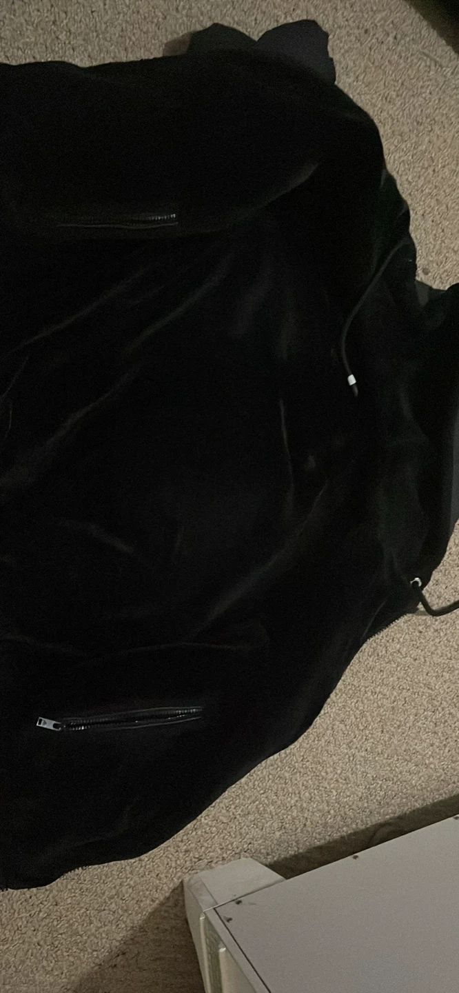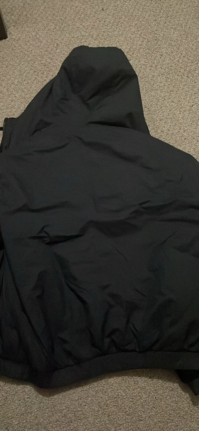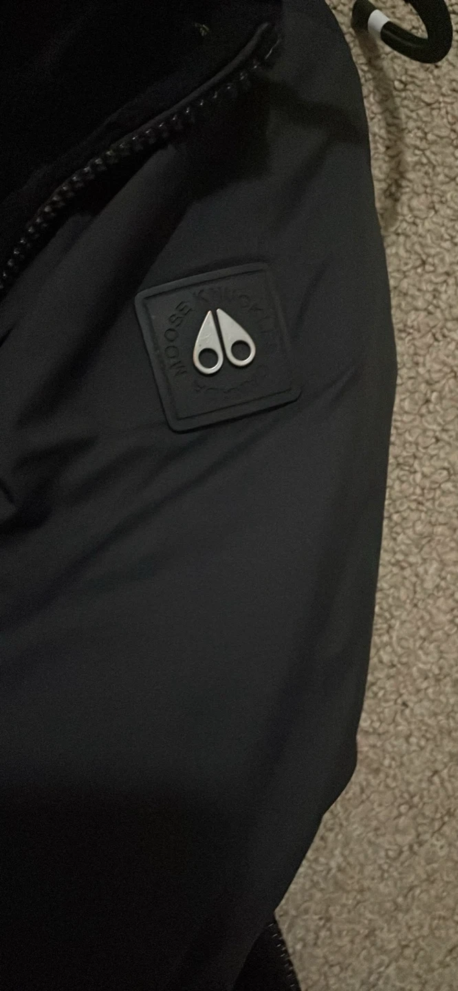 Black Moose Knuckles jacket. It's made of durable material. This jacket's great for staying warm on chilly days!