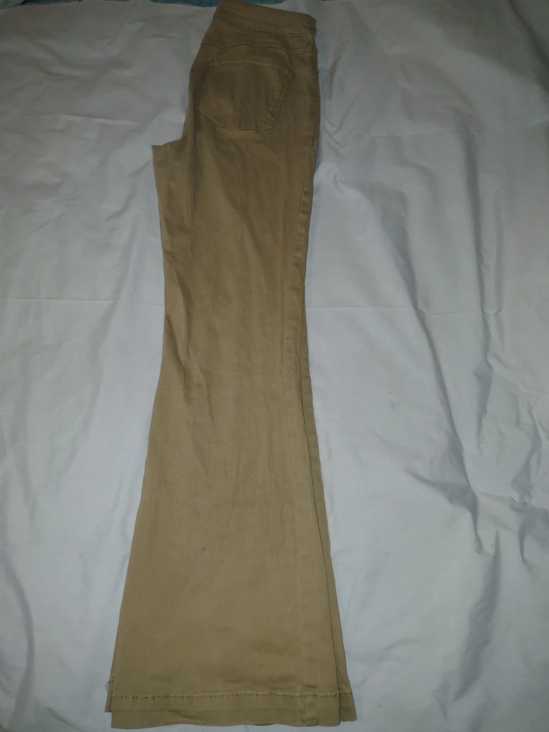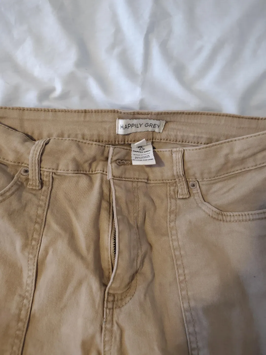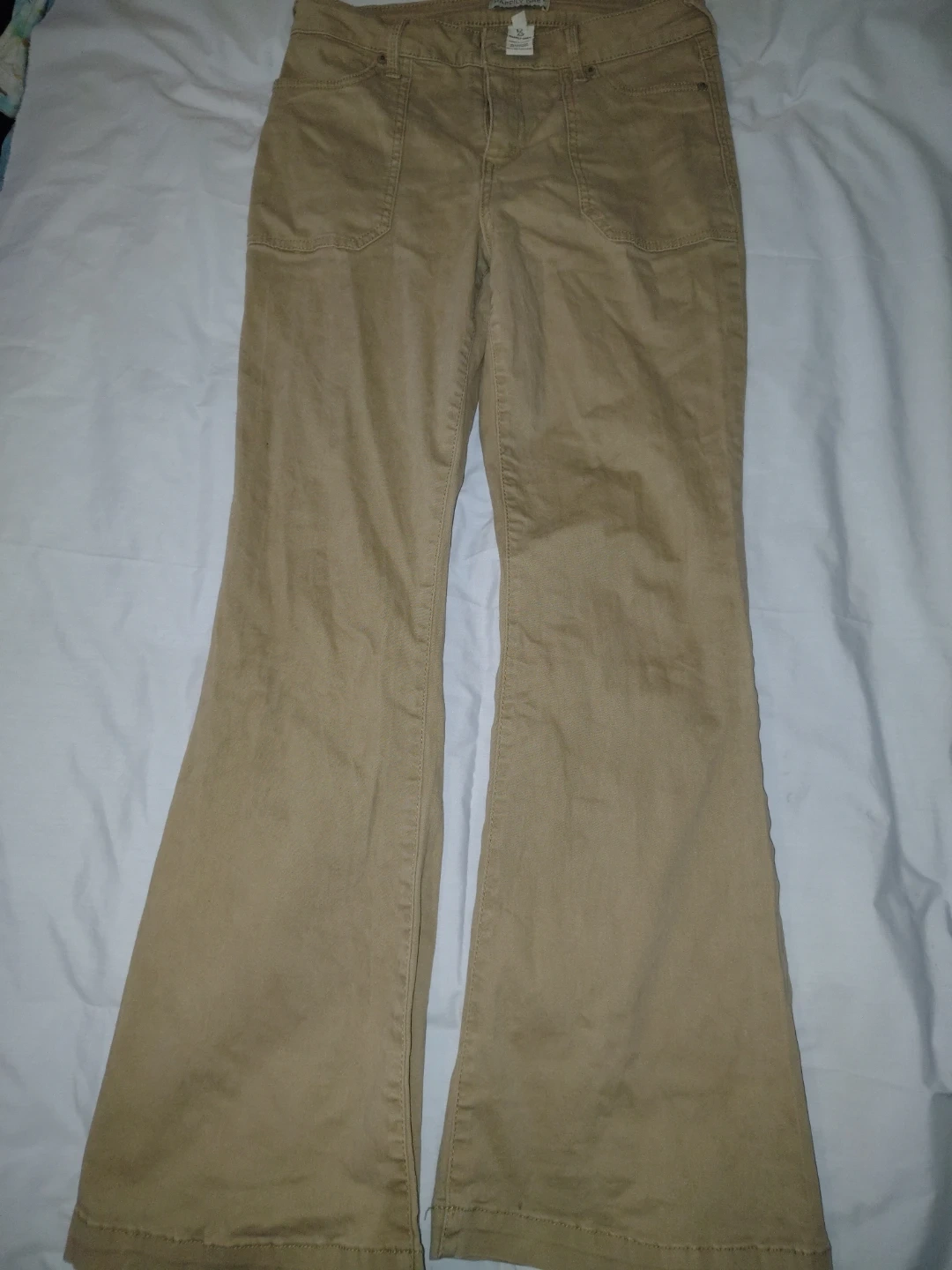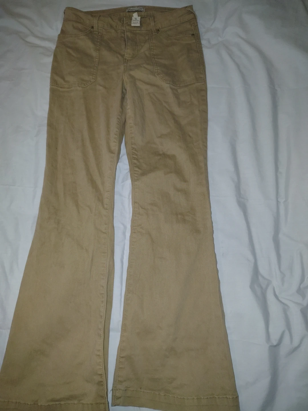 These are khaki flare pants by Happily Grey. They're a size 15. Made from 98% cotton and 2% spandex.