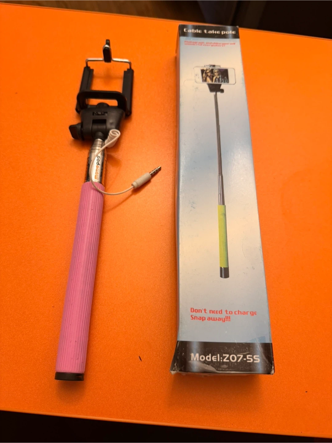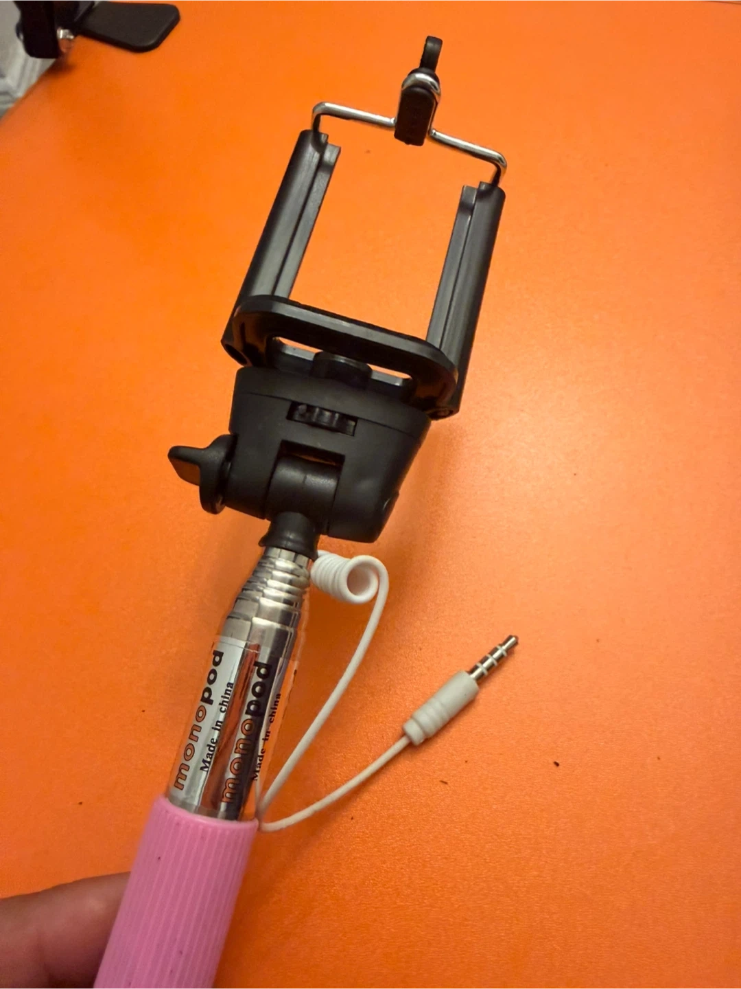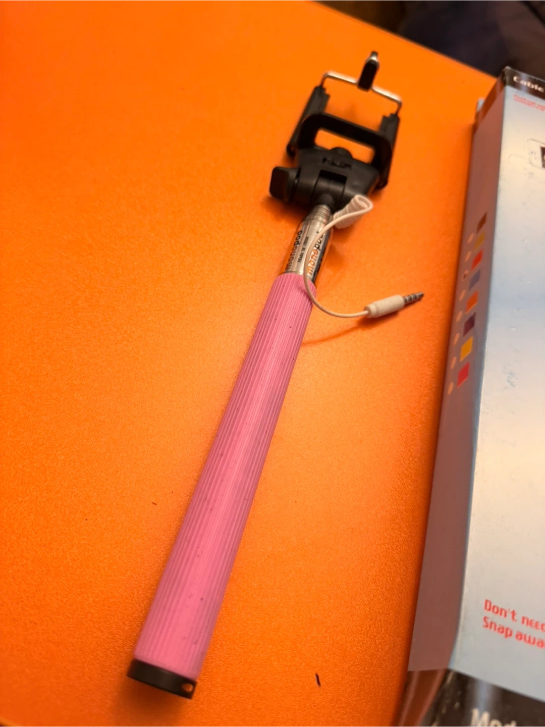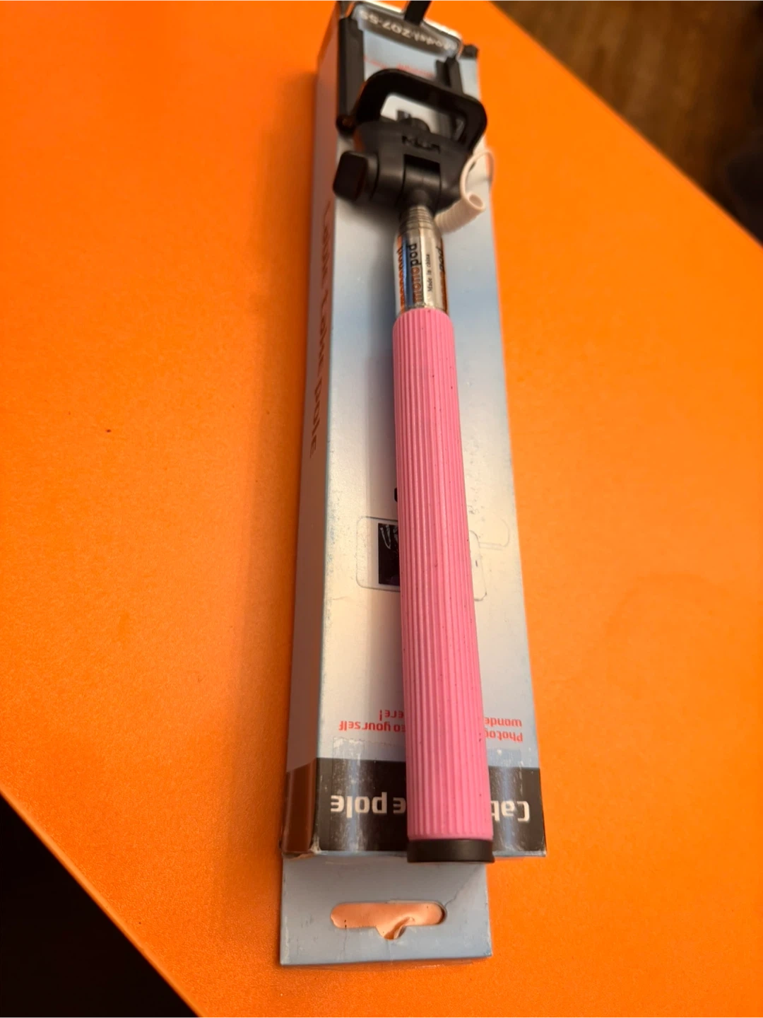 This pink extendable selfie stick features a built-in shutter button and a headphone jack connector. It's designed for easy phone mounting. Extendable design allows for wider shots. Great for capturing moments from different angles!