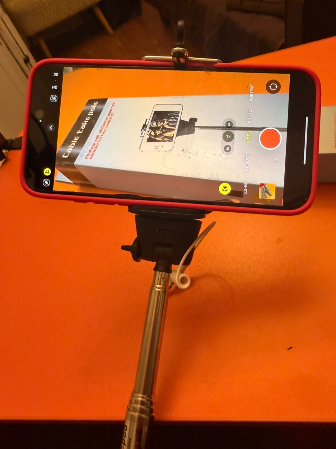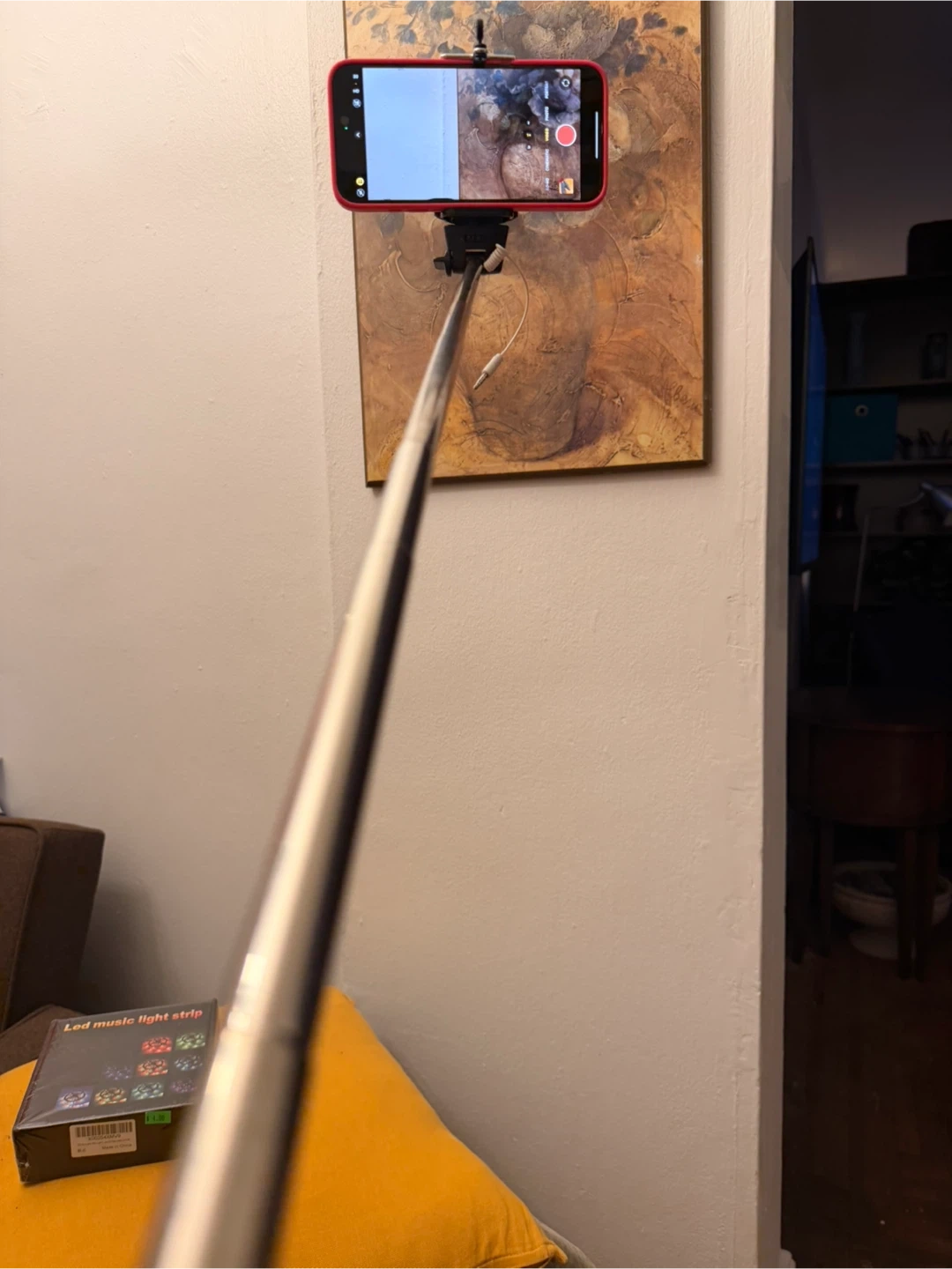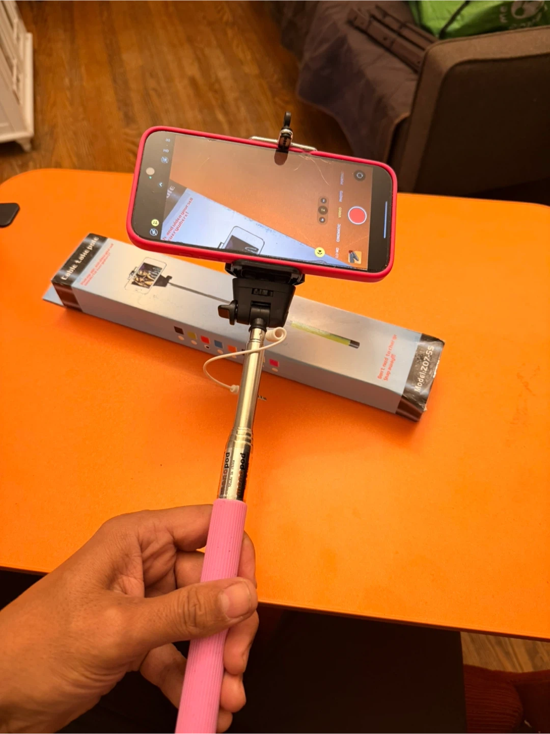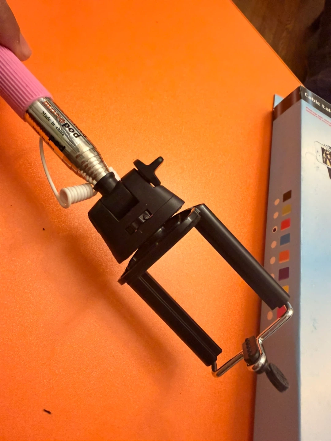 This pink extendable selfie stick features a built-in shutter button and a headphone jack connector. It's designed for easy phone mounting. Extendable design allows for wider shots. Great for capturing moments from different angles!