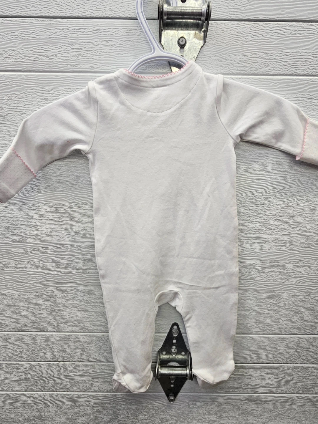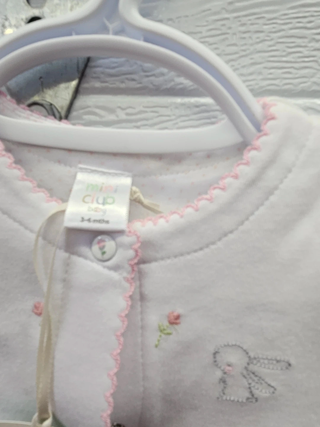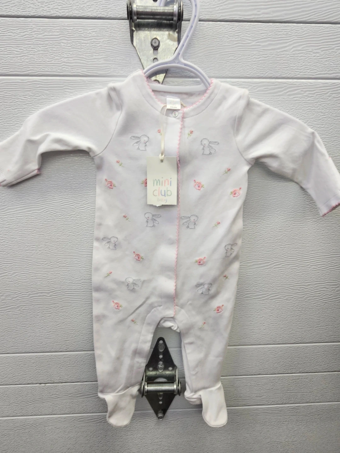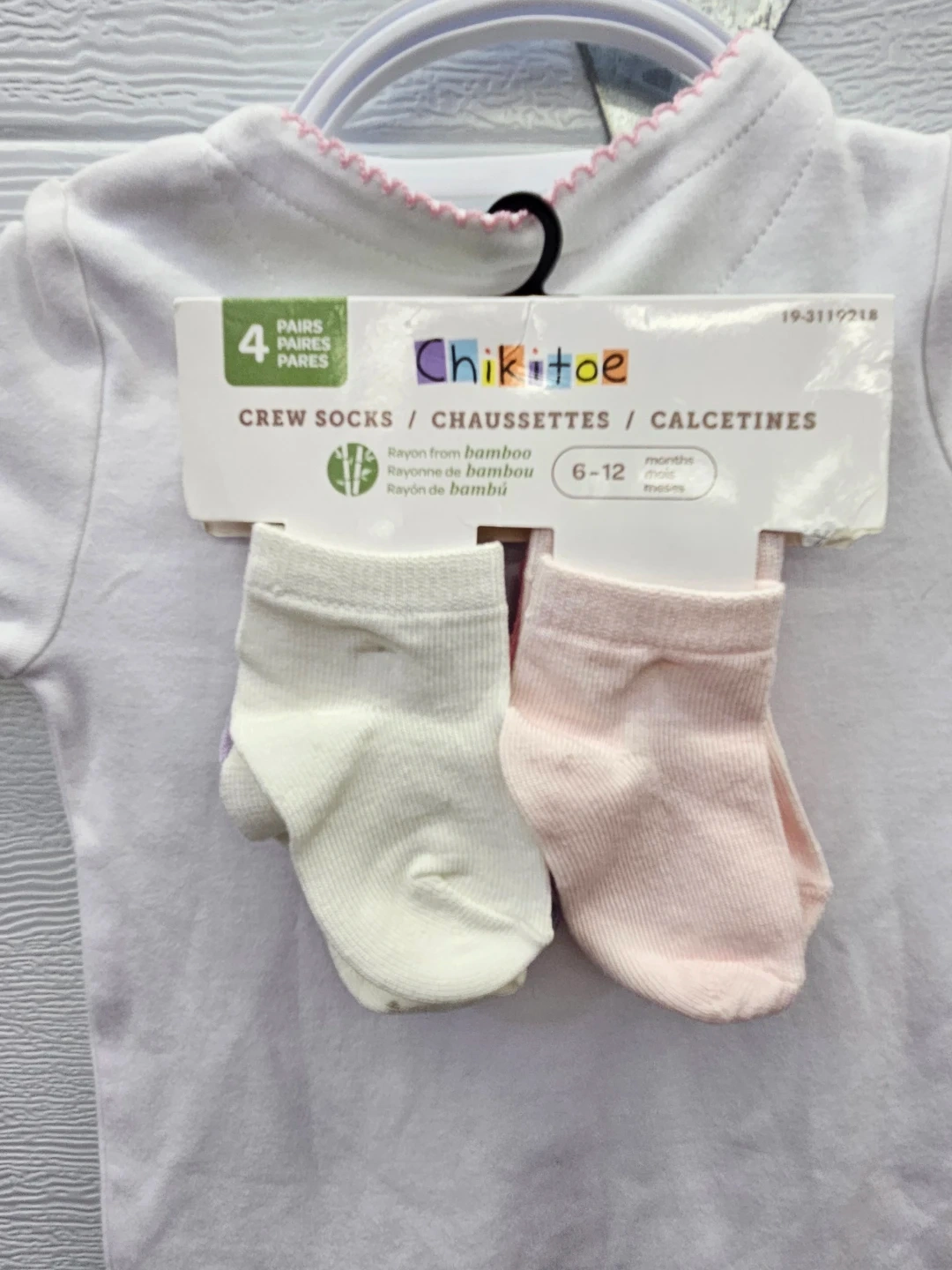 White long-sleeved sleepsuit with bunny and floral print. Includes a 4-pack of Chikitopoe crew socks in sizes 6-12 months. The sleepsuit is size 3-6 months.