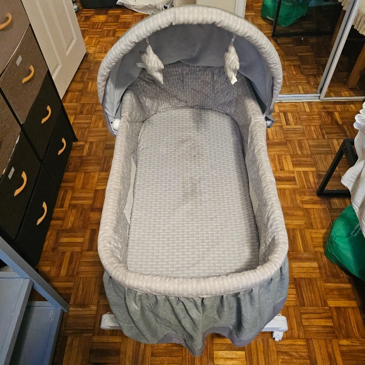 Grey and white bassinet. Features a stand with storage shelf. Includes canopy and hanging toys. Gently used.
