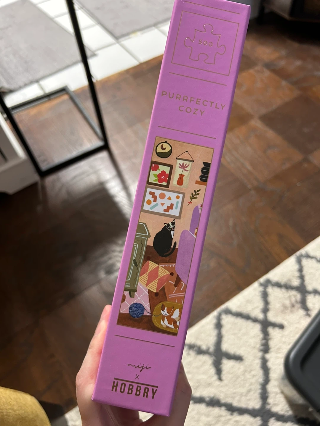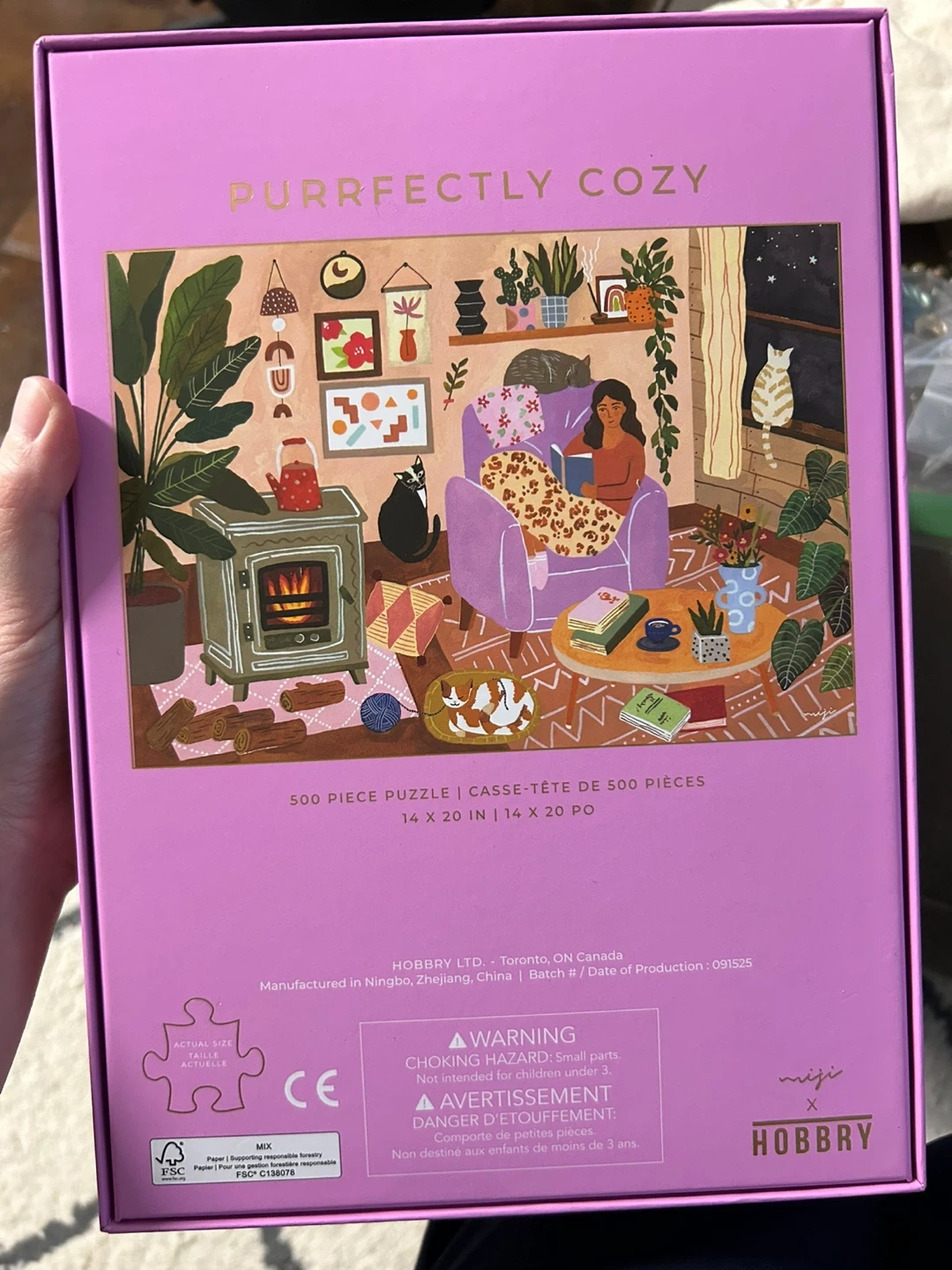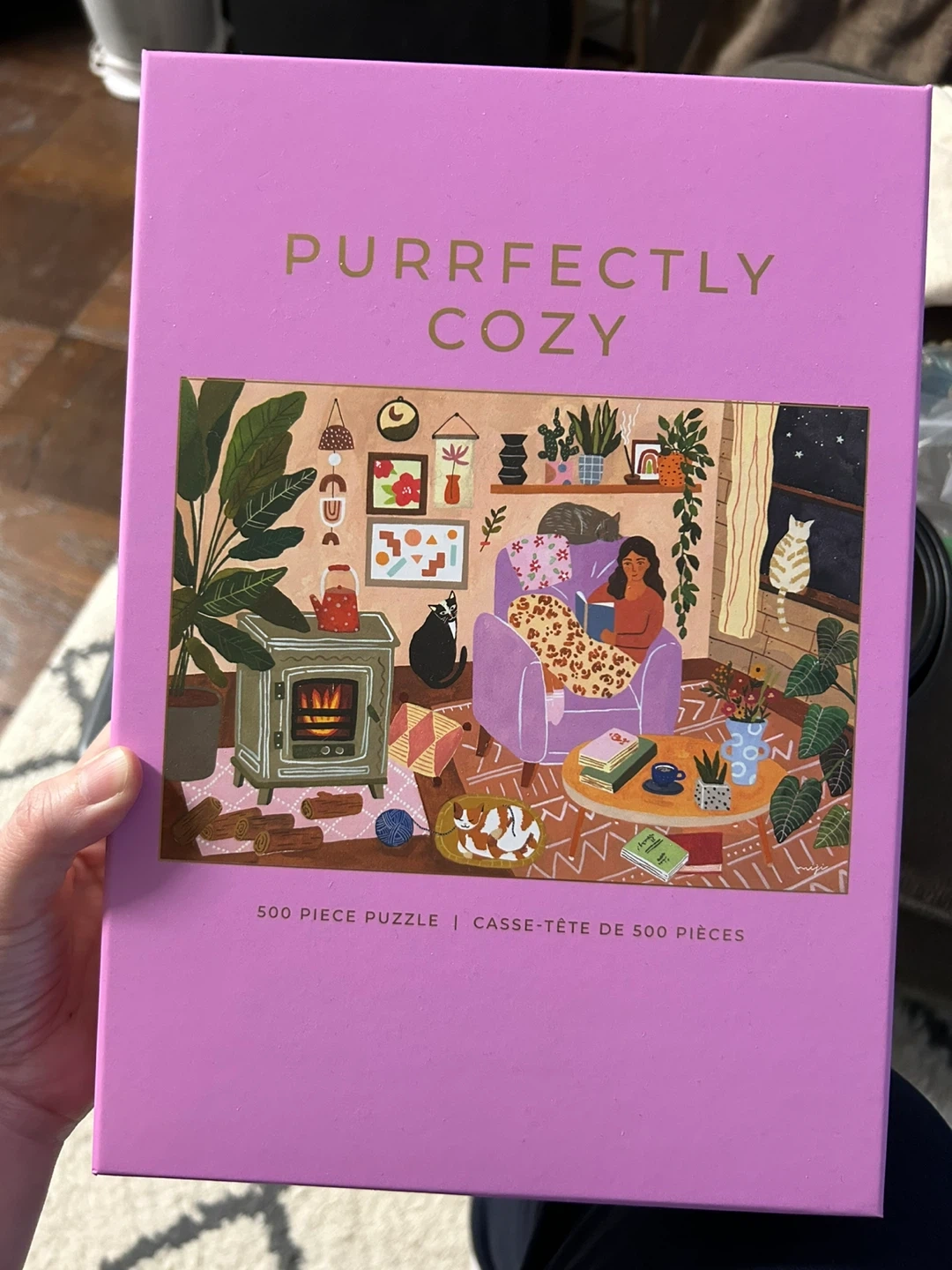 This is a 500-piece puzzle called "Purrfectly Cozy." It measures 14 x 20 inches when completed. The puzzle features a cozy indoor scene with cats and plants.