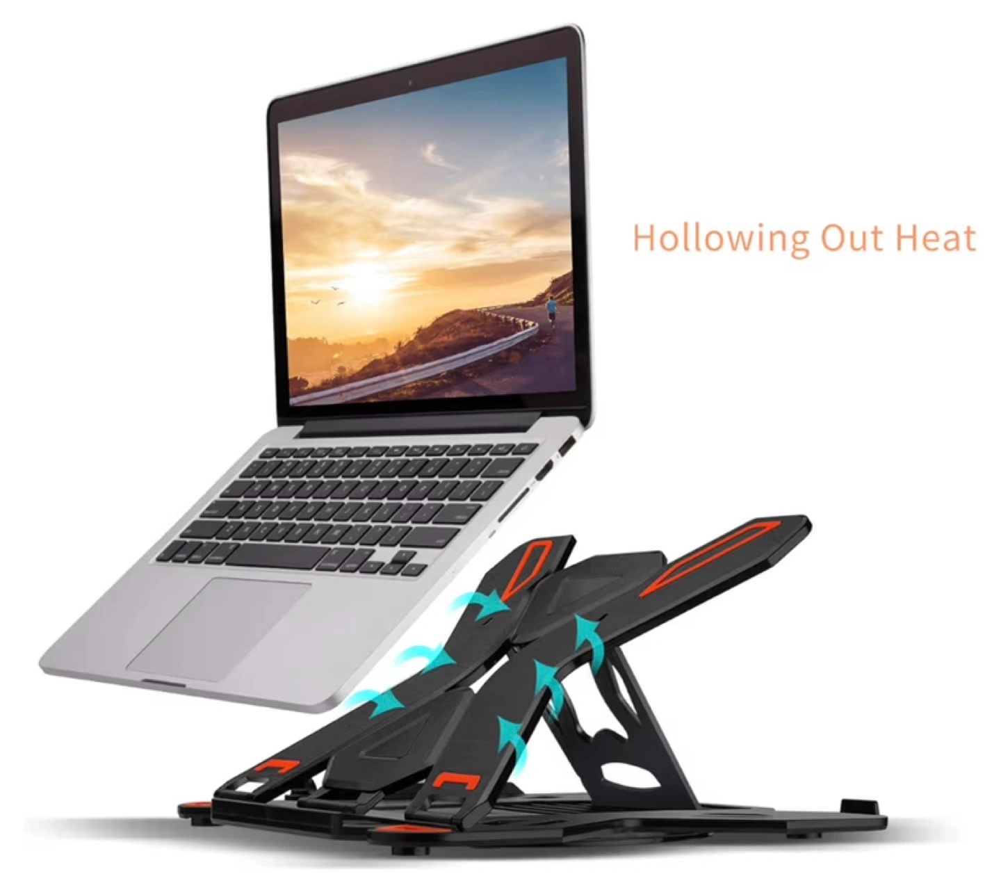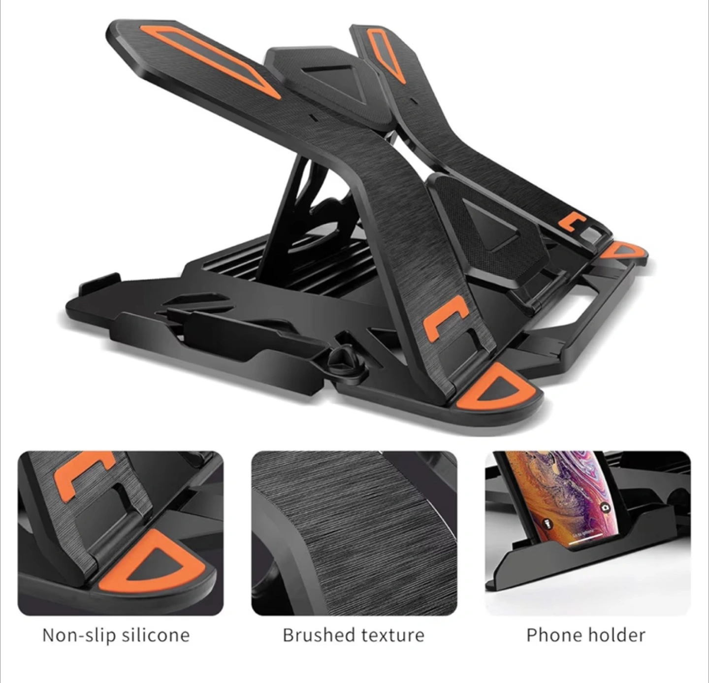 Laptop stand, folding design. Features a phone holder. Made with non-slip silicone. The stand has a brushed texture. It could provide a more comfortable experience for your work or entertainment.