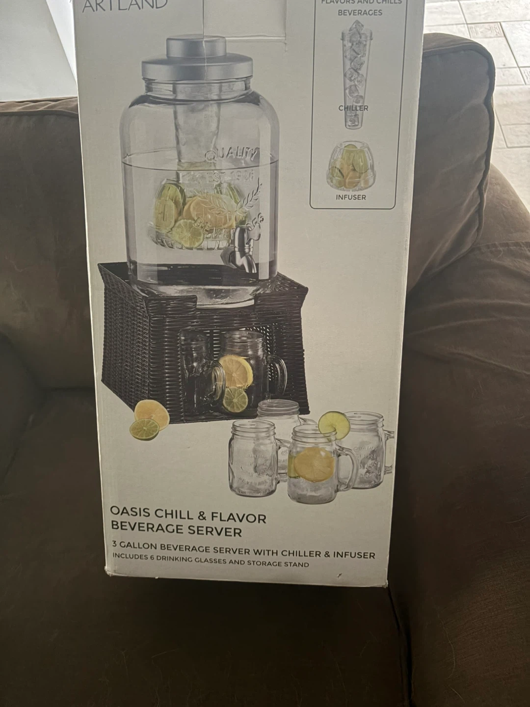 This 3-gallon beverage server includes a chiller and infuser. It comes with a few drinking glasses and a storage stand. Great for parties and gatherings!