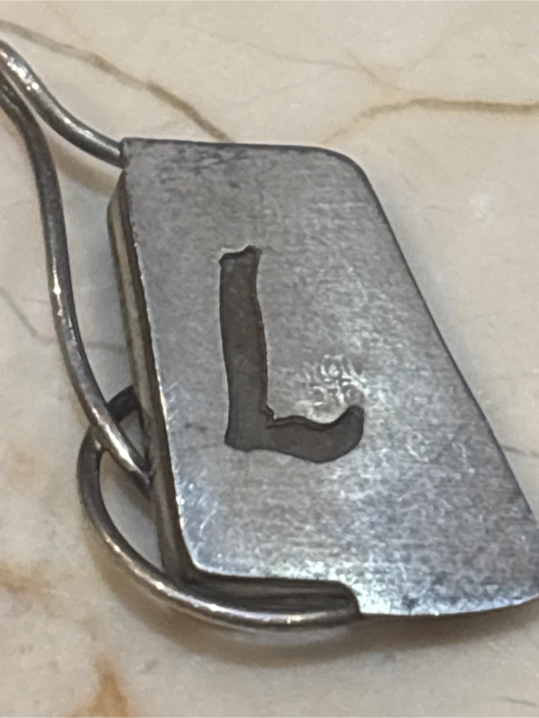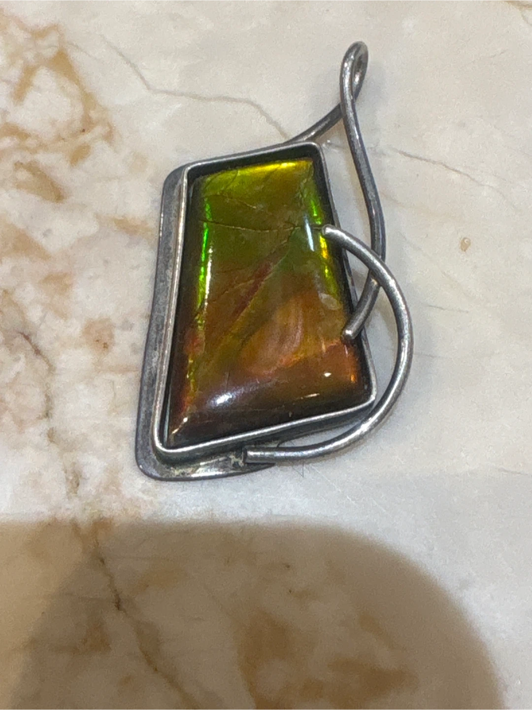 Selling a unique silver pendant! It features a distinct letter 'L' detail on backside and signed C.Noie side and a beautiful iridescent Amonite stone on the other. A great accessory to add a touch of personality to any outfit