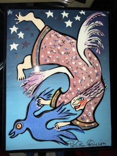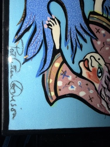 This vintage decorative tile, signed by artist Pat Custer Denison in 2003, features a unique design of angels needing training. Hand painted on ceramic, this 6” x 8” tile showcases a multicolor glossy finish, adding a touch of artistry to any room. Made in the United States, this handmade tile is a charming addition to any collection of decorative ceramics.