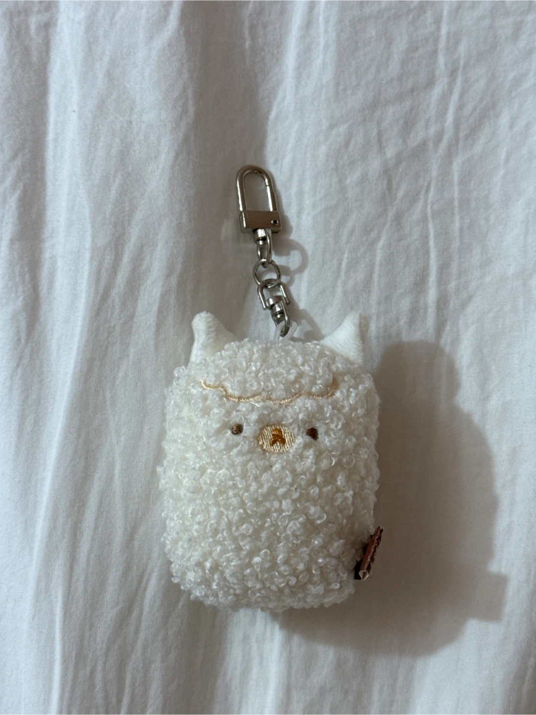 A cute, fuzzy plush charm with a kawaii face. It's white and has a fuzzy, curly texture. Attached is a silver clip for easy hanging. Perfect for decorating a backpack or bag! from korea