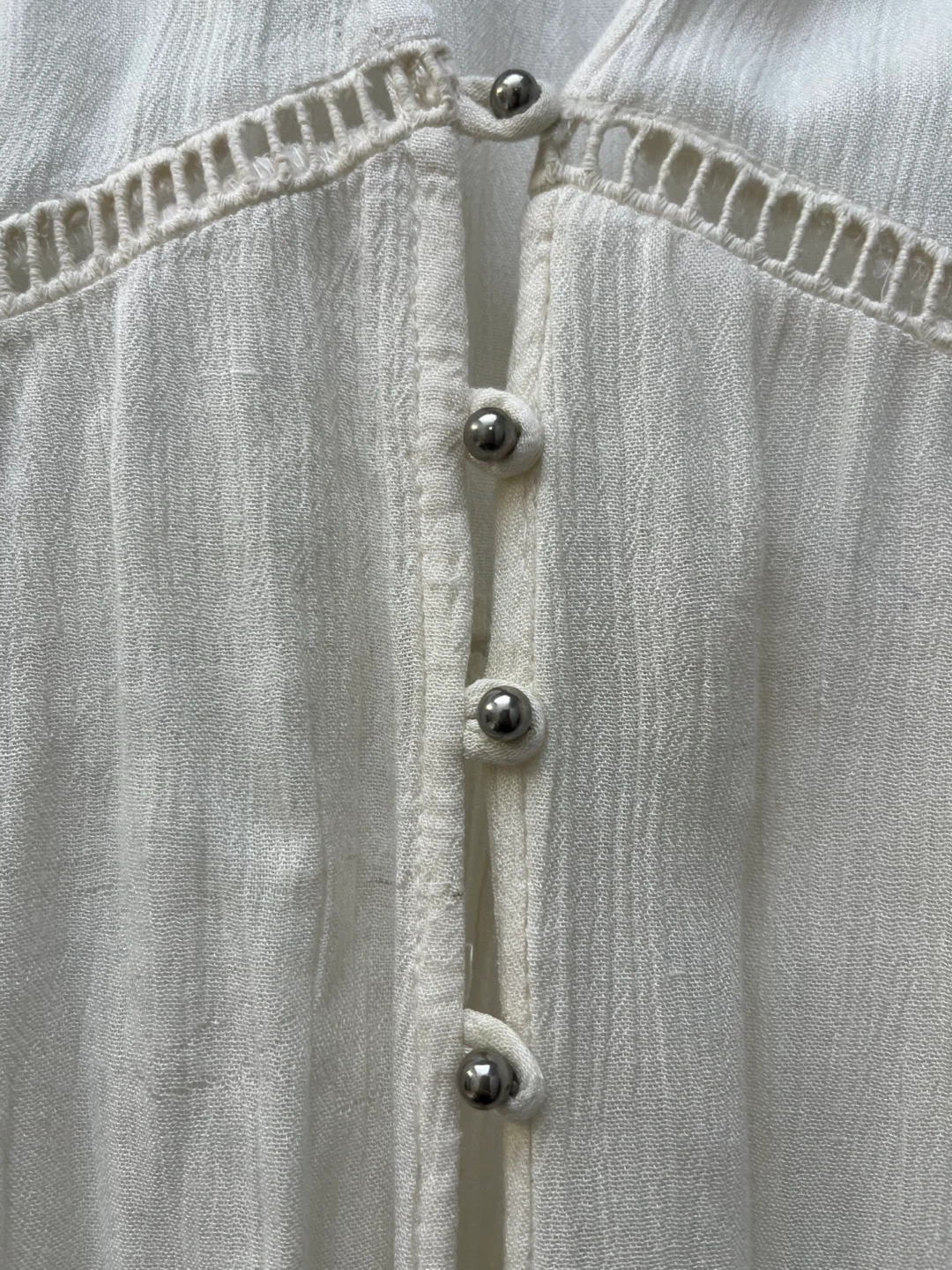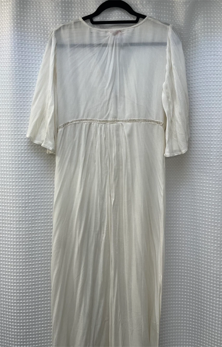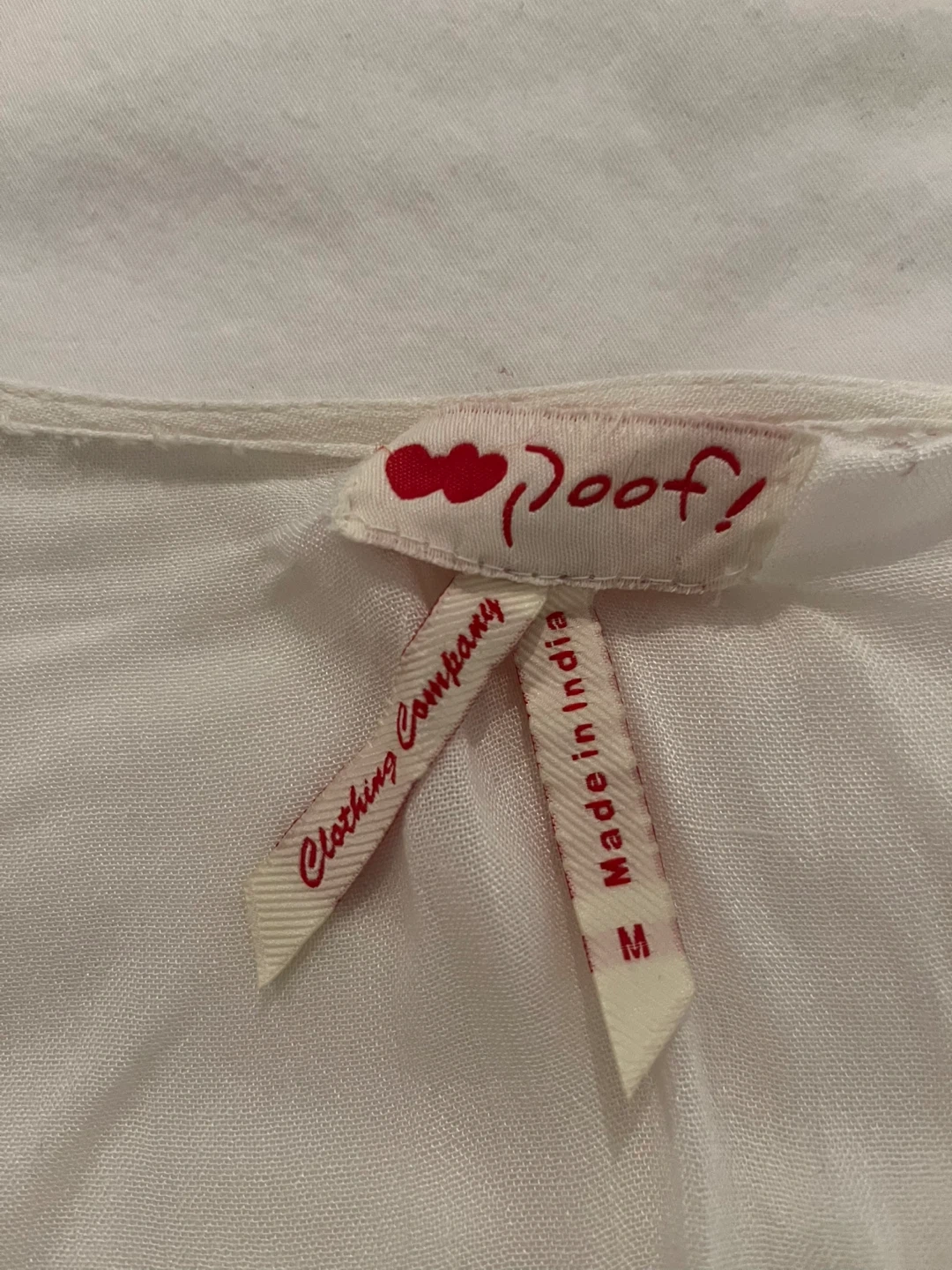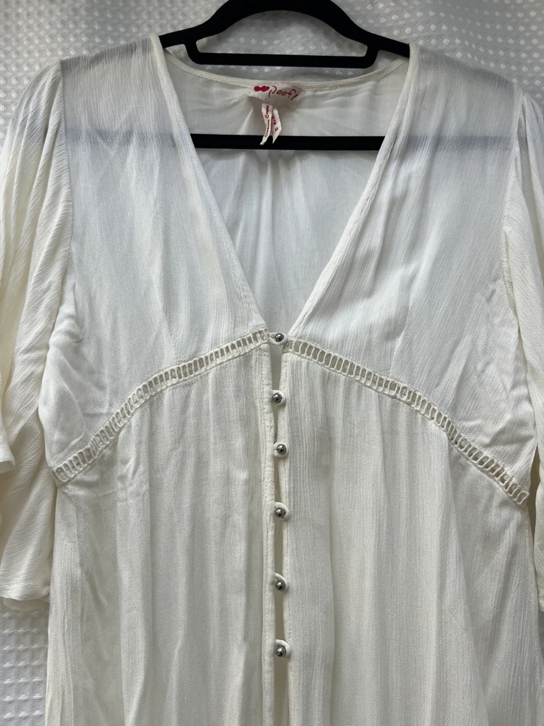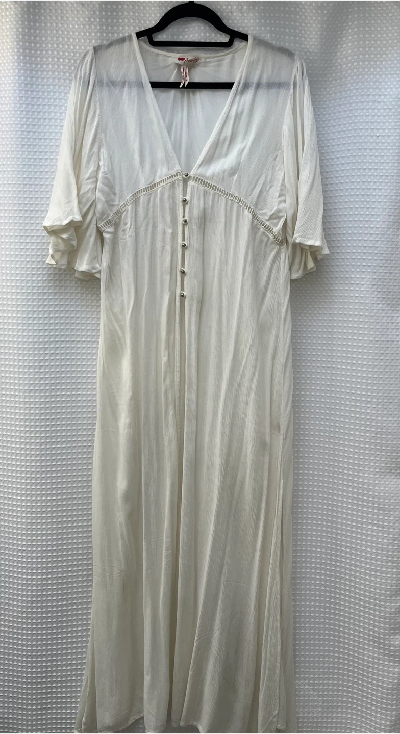 This is a Poof! Clothing Company white kimono/cover up. It's a size medium with flutter sleeves and button detailing down the front. Made in India. Never worn.