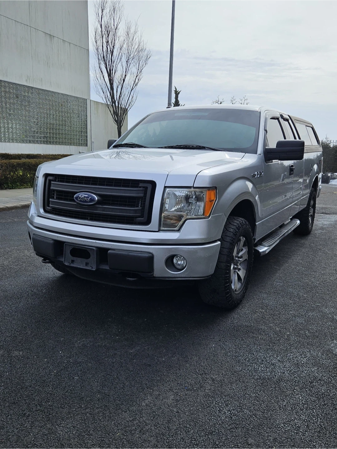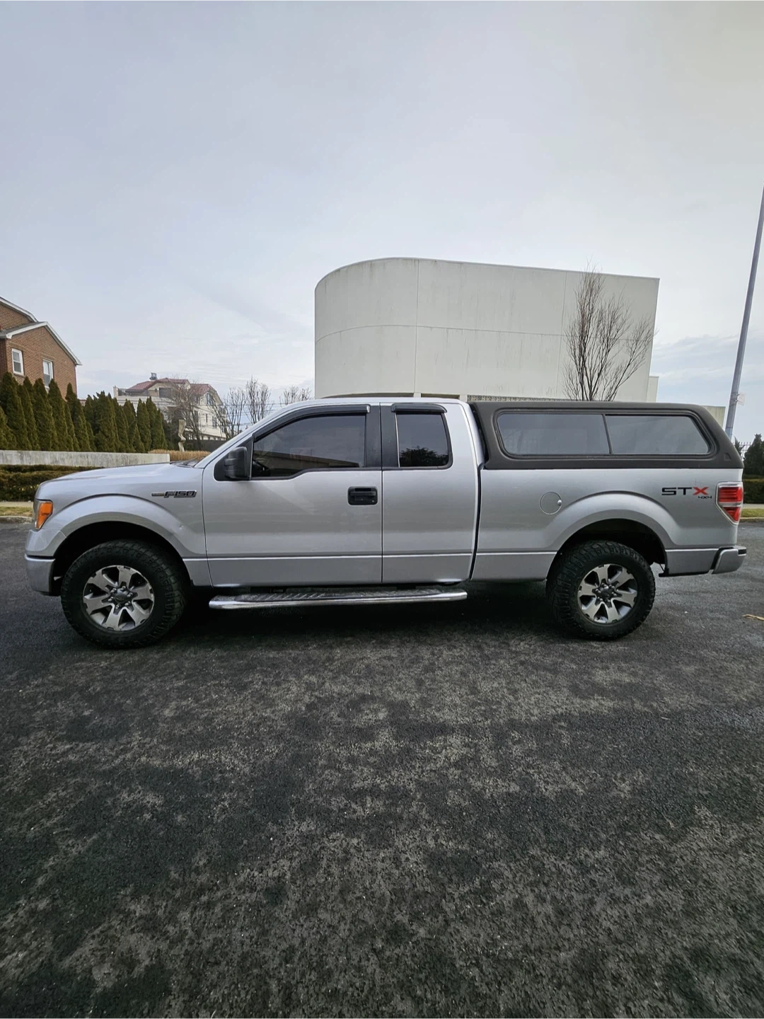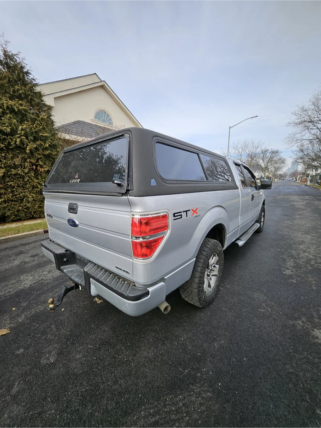 This is a silver Ford F-150 STX truck. It's equipped with a Leer truck cap for extra storage. The interior features grey cloth seats and an upgraded touchscreen infotainment system.107k