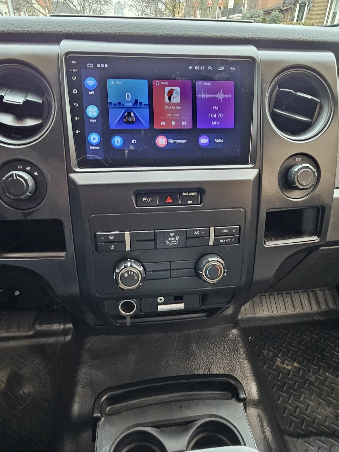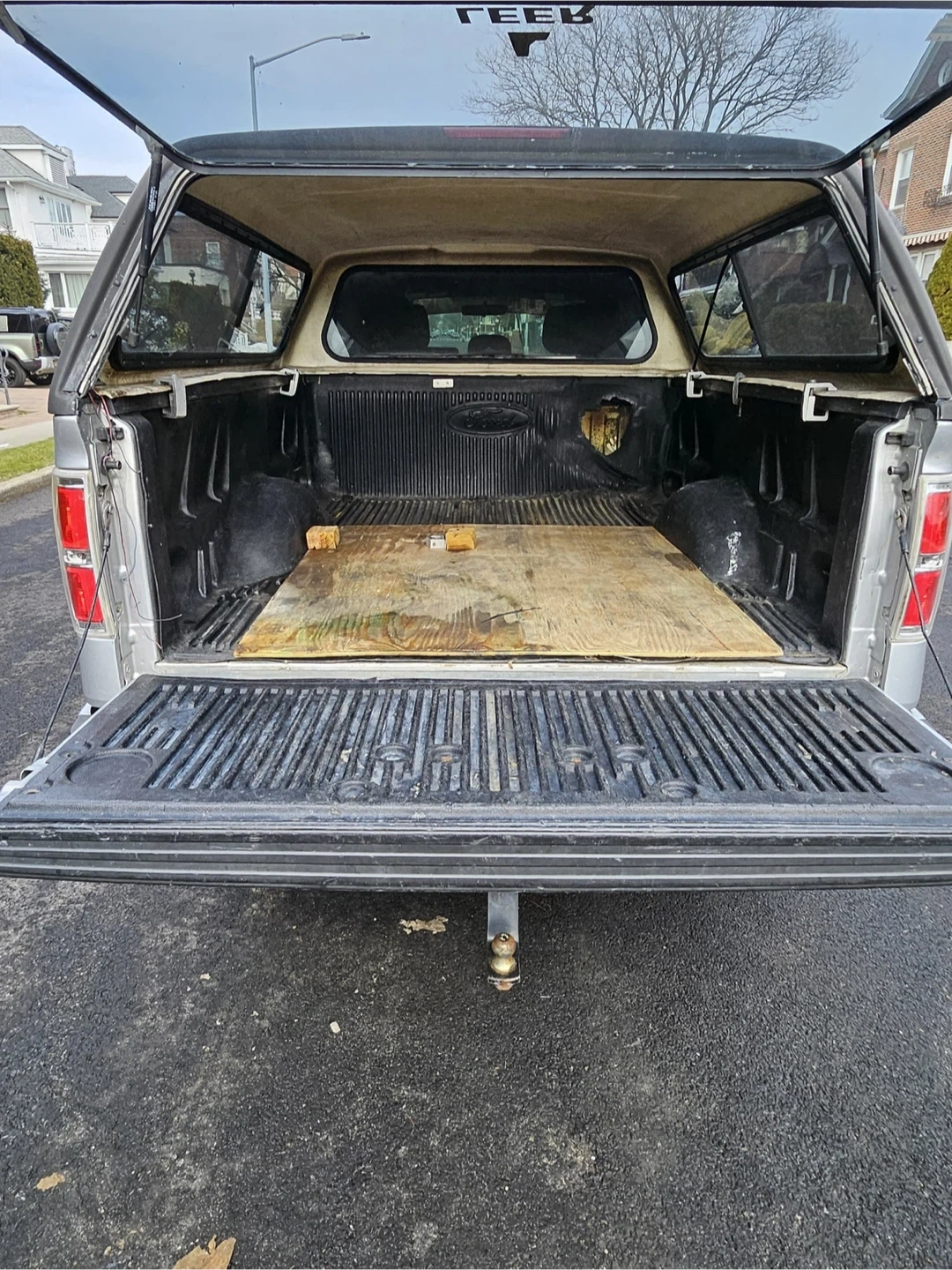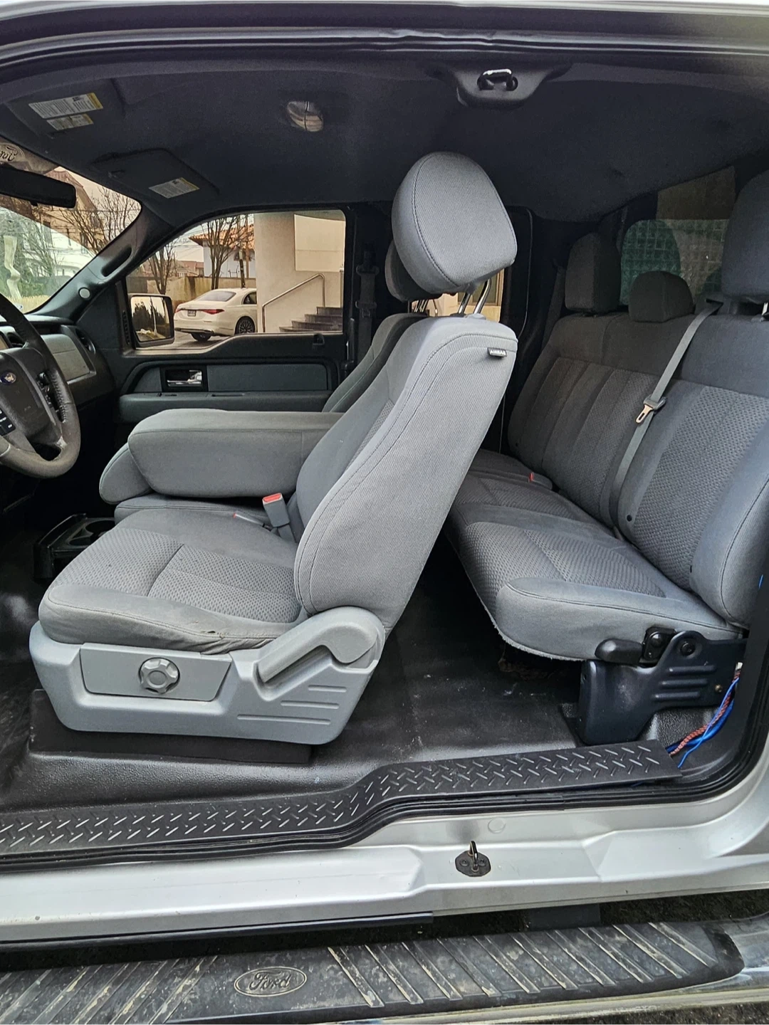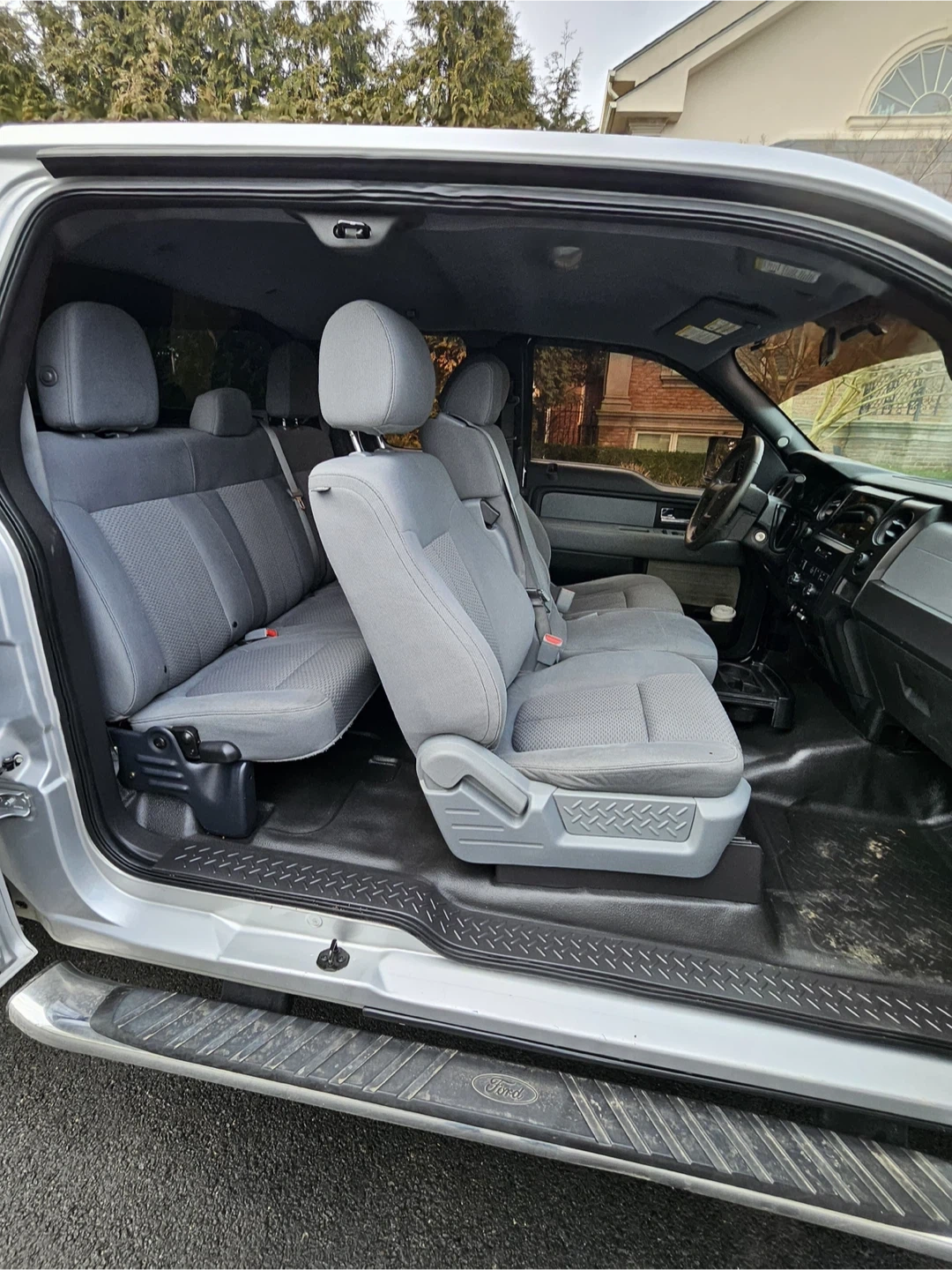 This is a silver Ford F-150 STX truck. It's equipped with a Leer truck cap for extra storage. The interior features grey cloth seats and an upgraded touchscreen infotainment system.107k