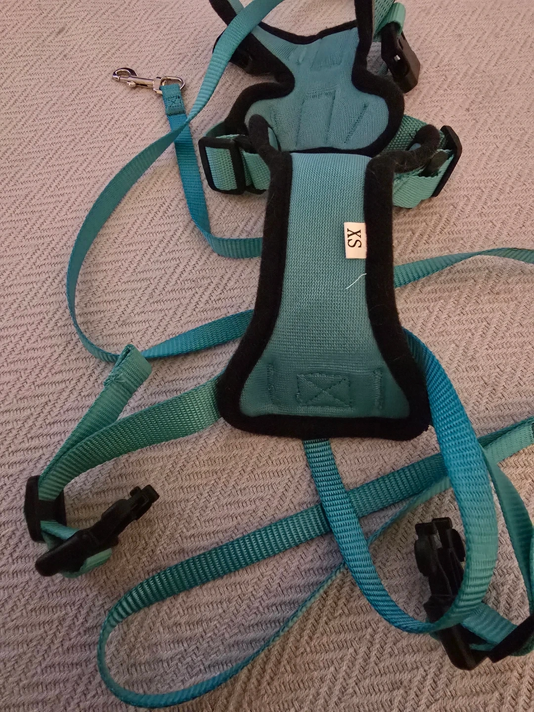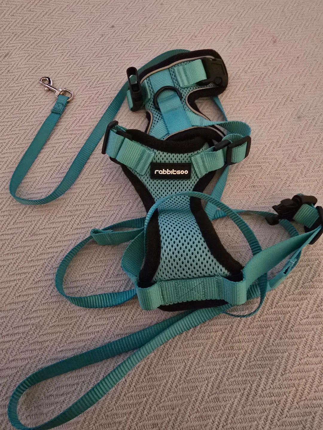 This is a Rabbitgoo pet harness and leash set in teal. It's a size XS. The harness features breathable mesh fabric and adjustable straps for a comfortable fit. It includes a matching leash.