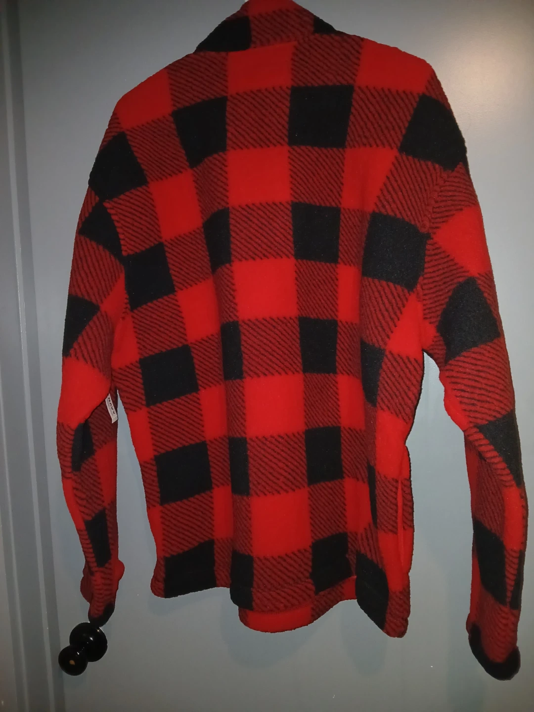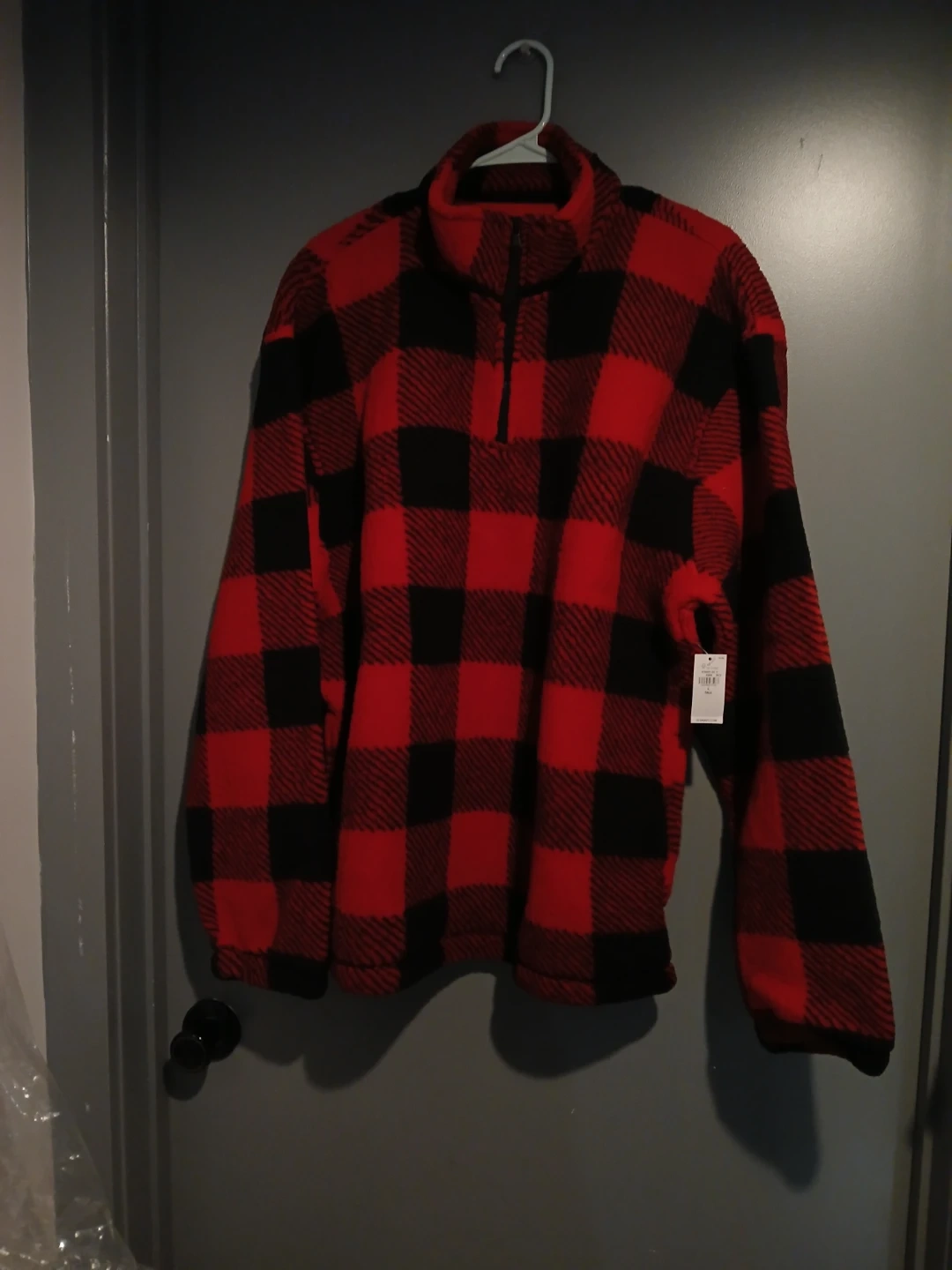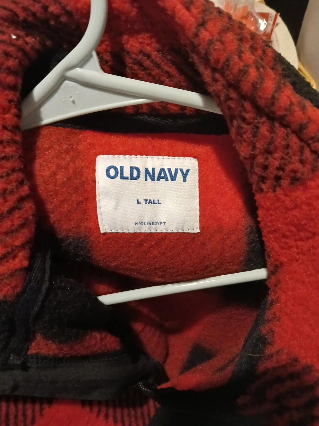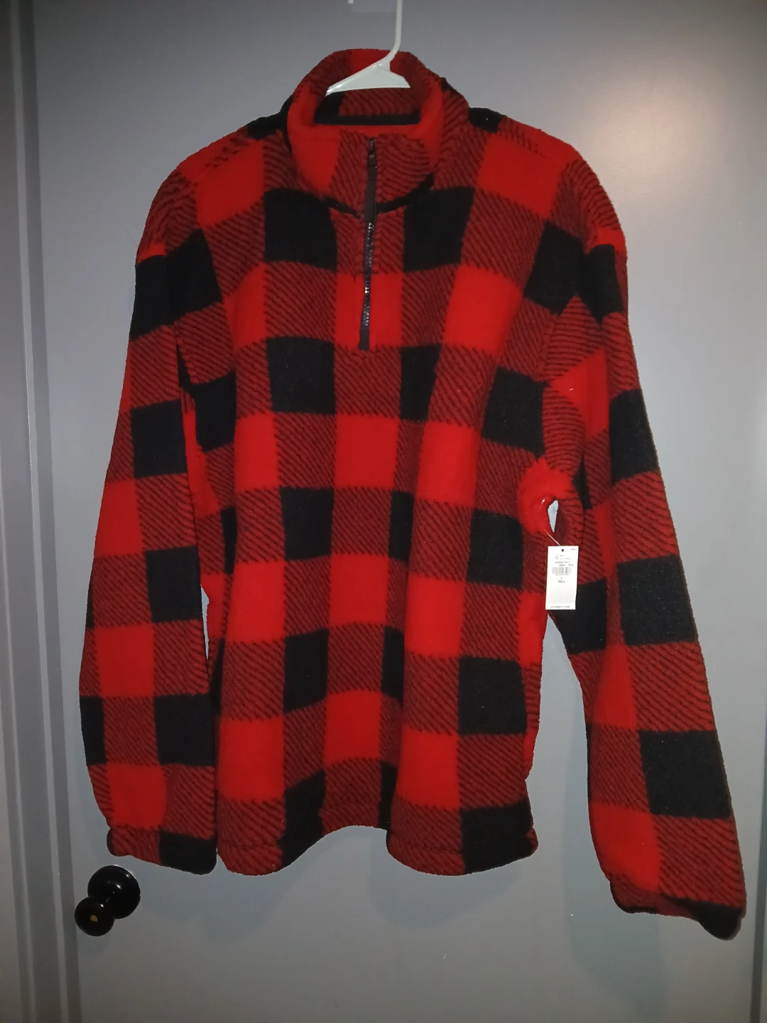 Old Navy quarter zip pullover fleece jacket. Features a classic red and black buffalo plaid pattern. Made in Egypt. Size L Tall. It's a cozy fleece perfect for cooler weather!