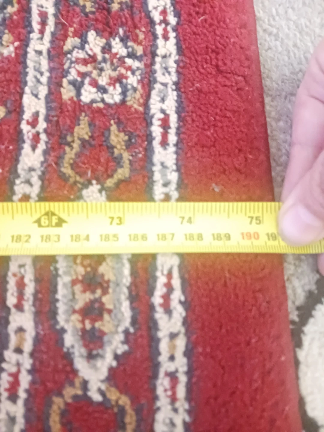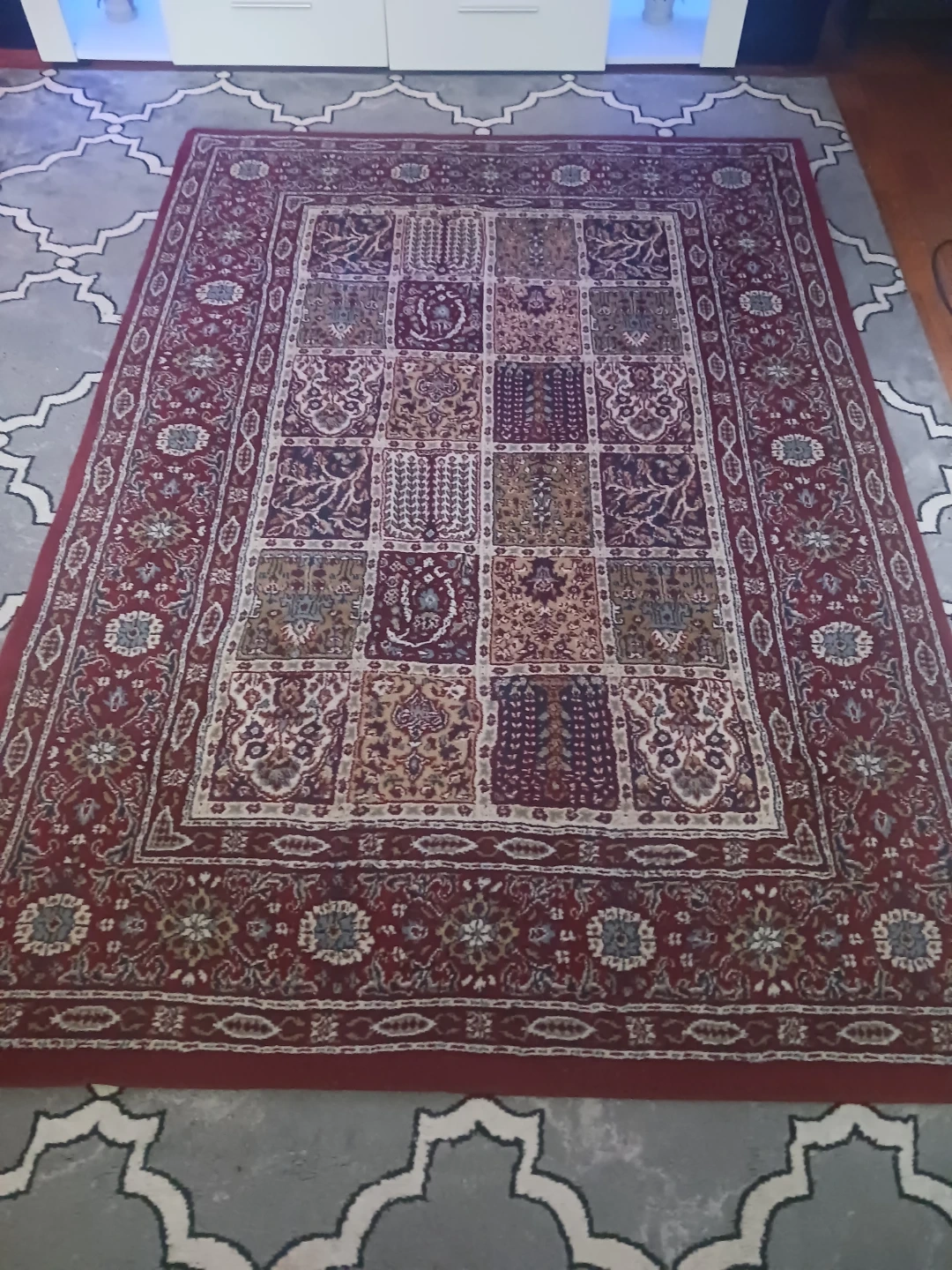 This is a large area rug featuring a detailed red oriental pattern. The rug measures approximately 8 feet by 10 feet. It's suitable for adding warmth and style to a living room or bedroom.