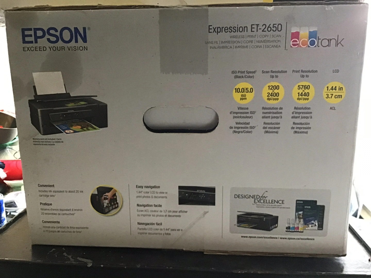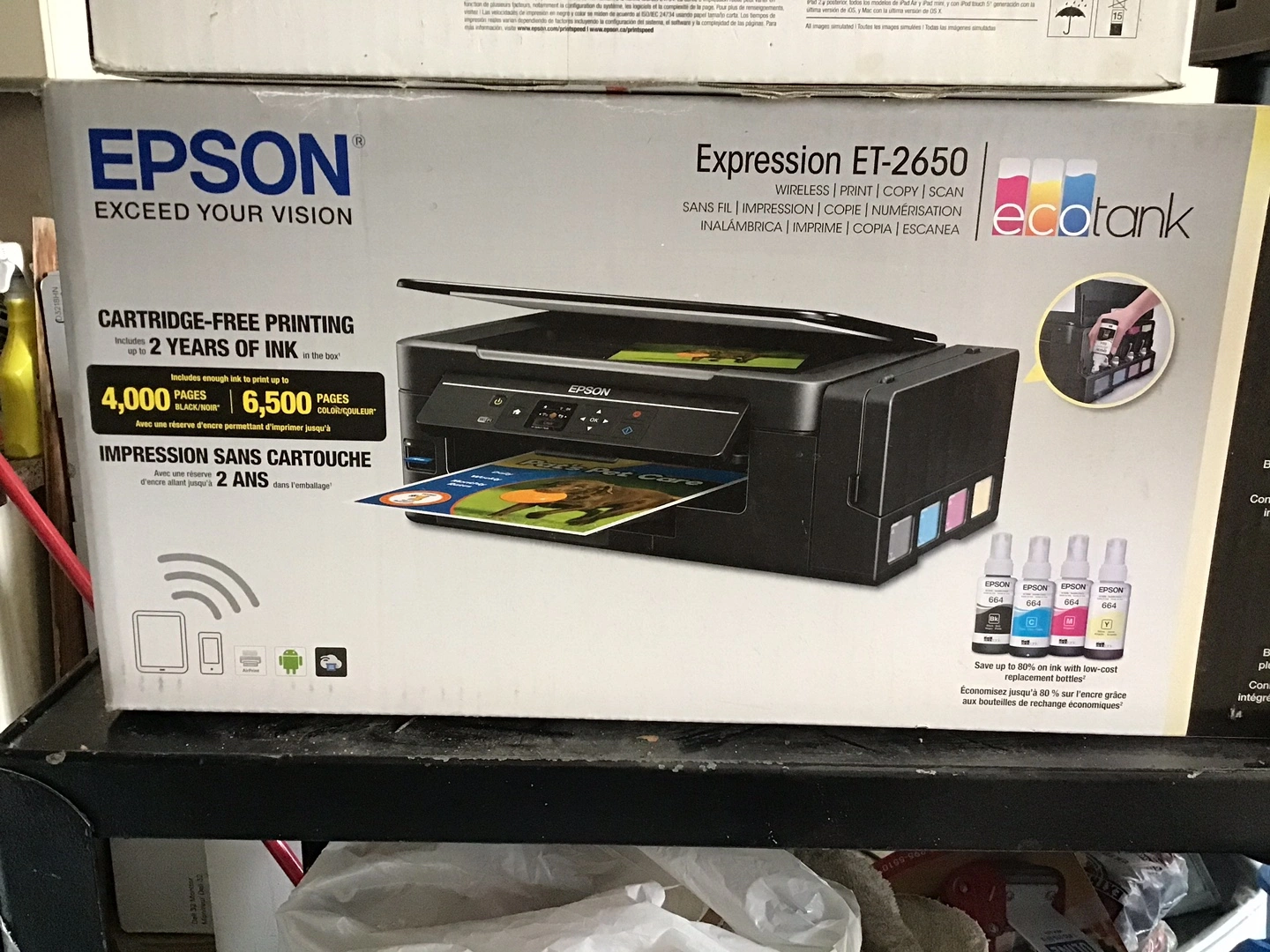 New unopened Never used Selling an Epson Expression ET-2650 EcoTank printer. It's a wireless printer that can print, copy, and scan. The box says it comes with up to 2 years of ink and can print up to 4,000 black/noir pages or 6,500 colour pages with the included ink