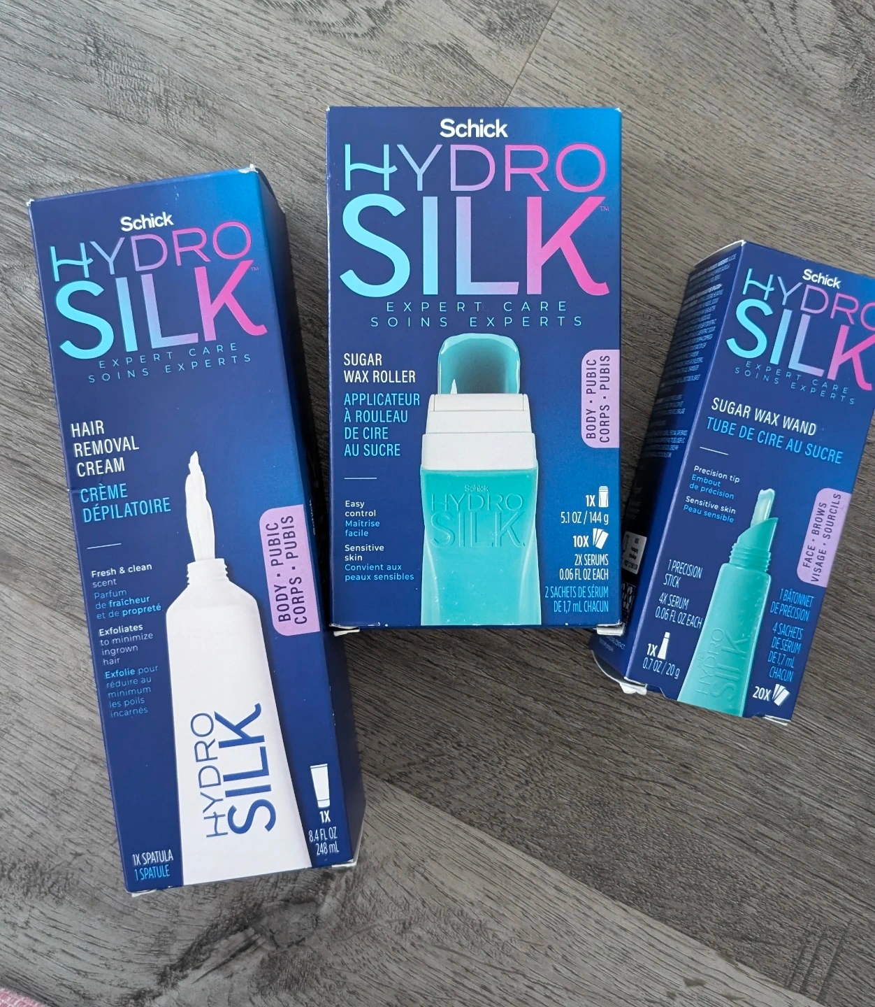 Schick Hydro Silk Hair Removal Cream (8.4 FL OZ / 248 mL) with a spatula. It also comes with a Sugar Wax Roller (5.1 OZ / 144 g) and two serum packets (0.06 FL OZ each). Finally, there's a Sugar Wax Wand with a precision tip and four serum packets (0.06 FL OZ each)