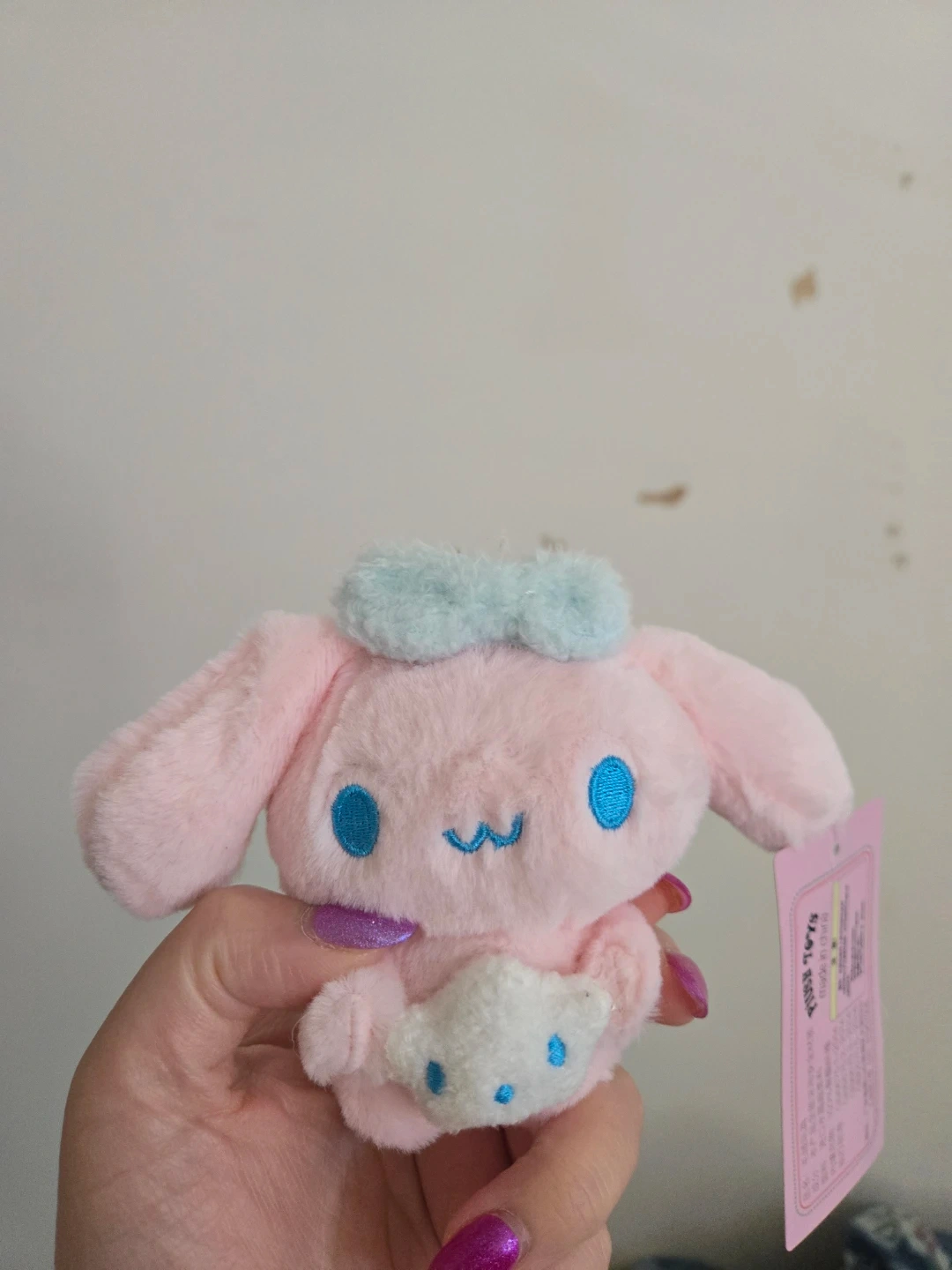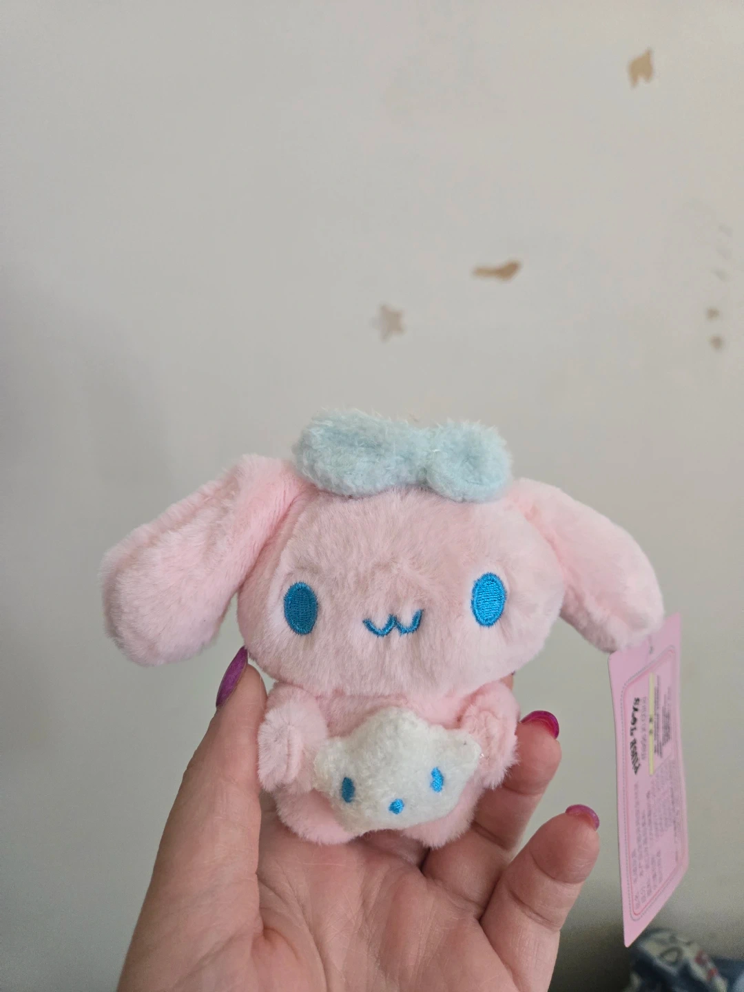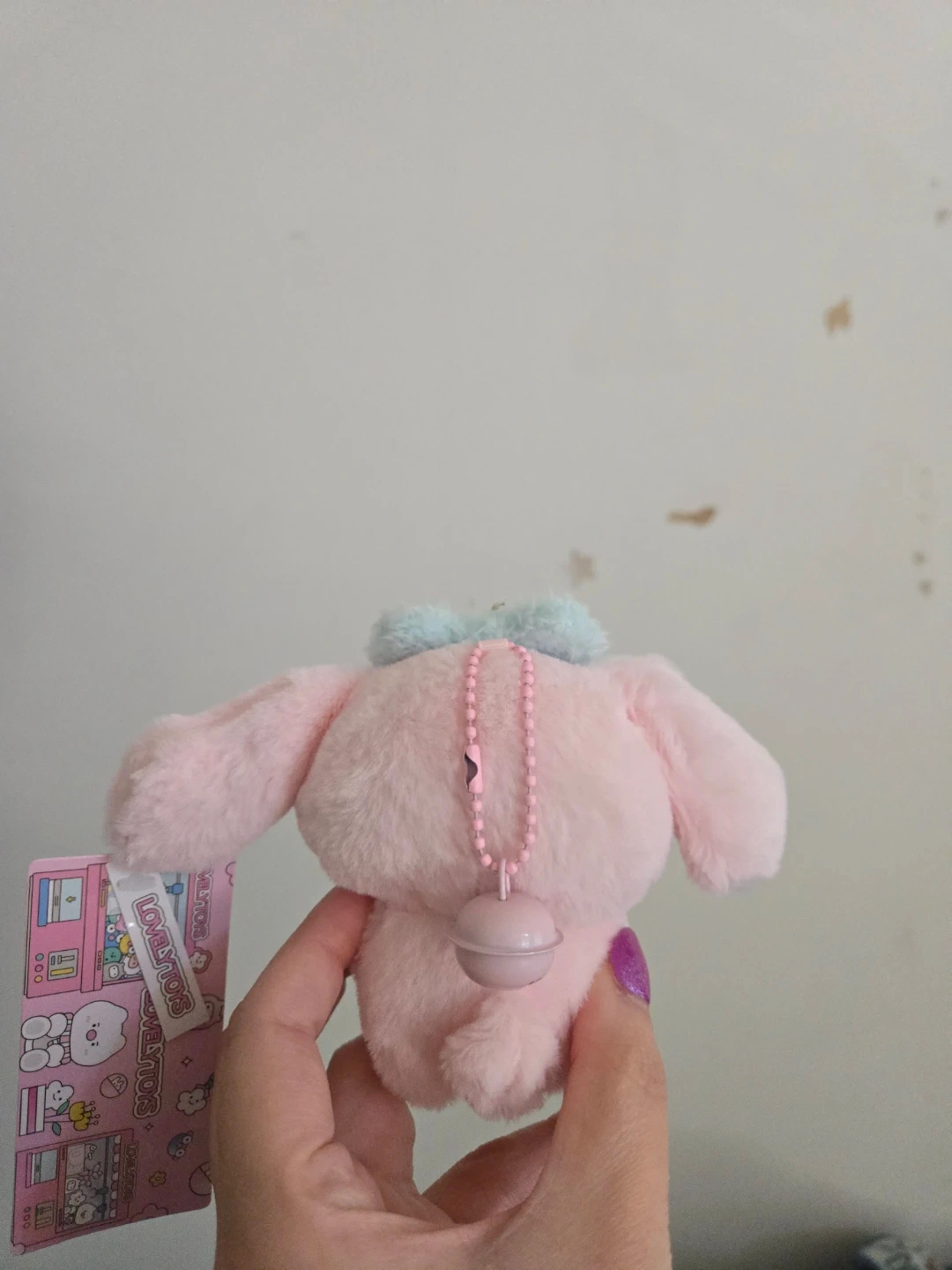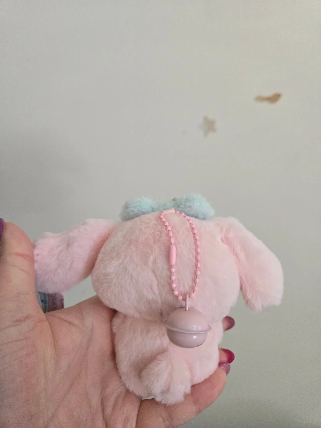 This is a super cute pink Cinnamoroll plush keychain! It's made of soft, fluffy material and has a little bell on the chain. It's the perfect size to clip onto a backpack or purse.