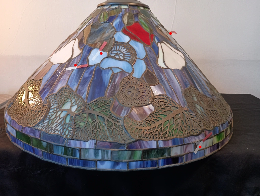 The structure of the shade is solid and the frame is intact but there are 22 glass panels that are cracked. Each panel is marked with a red sticky marker in the photos. The very top piece where the shade slides onto the metal threading to be secured is dented https://offerup.co/faYXKzQFnY?$deeplink_path=/redirect/ one spot.