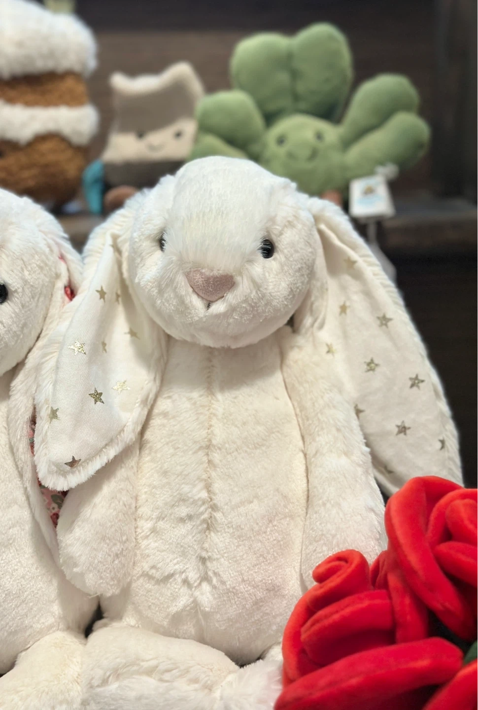 This adorable bunny is a fan favorite—she is famous for being incredibly soft and features a lovely "twinkle" effect that makes her feel truly magical. She is a perfect sleeping companion, and many owners love the gentle, weighted feel provided by the beans inside, which makes her extra cozy for cuddles.