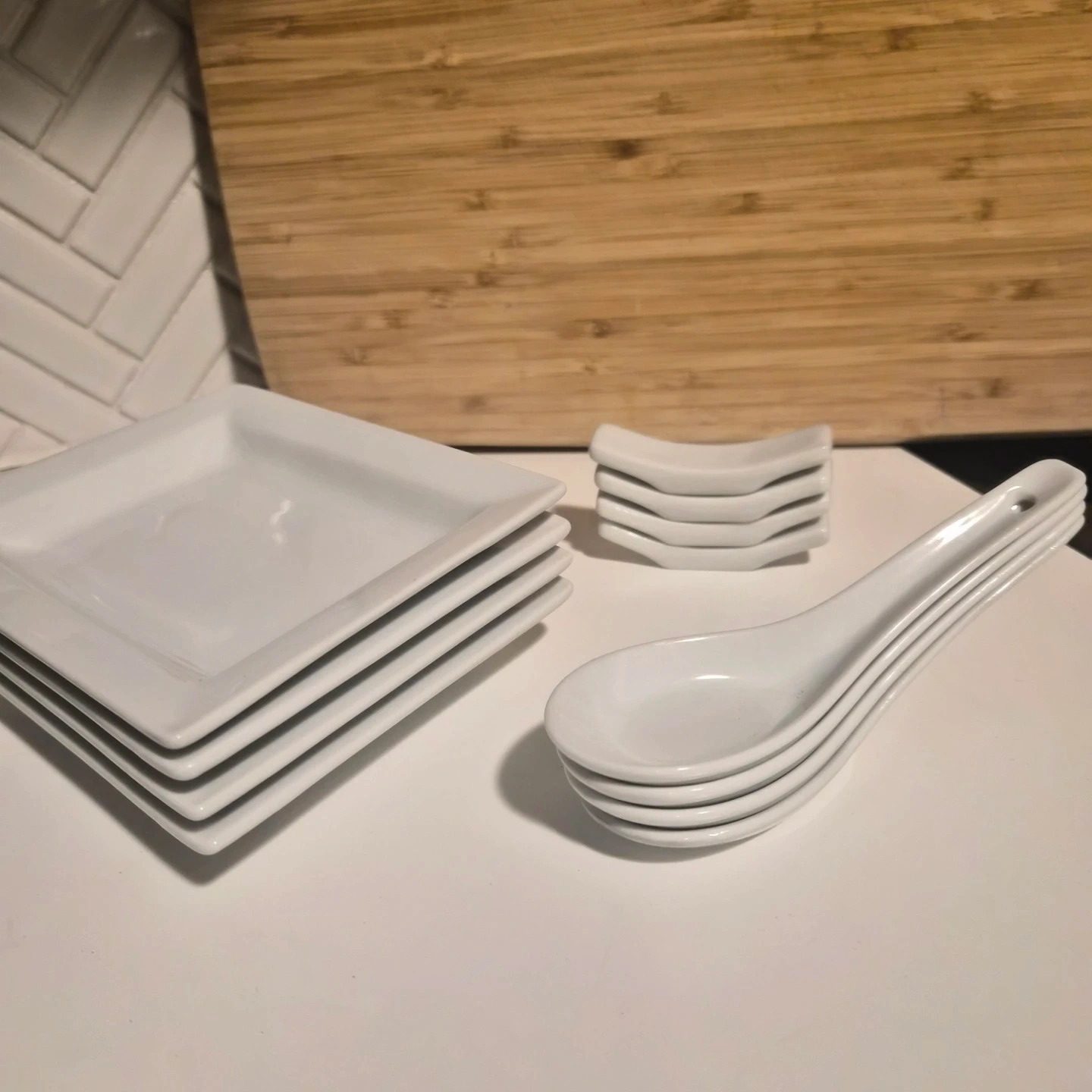 A set of four white square appetizer plates, perfect for serving small dishes. Also includes four white ceramic pho/ramen soup spoons and four chopsticks rests. This set is a special addition to any kitchenware collection.