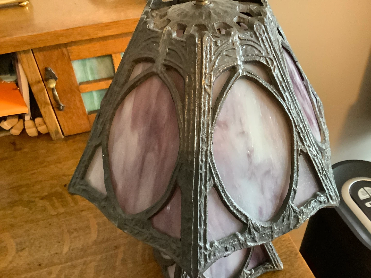 Art Nouveau Six Panel Slag Glass Tri-Light Table Lamp