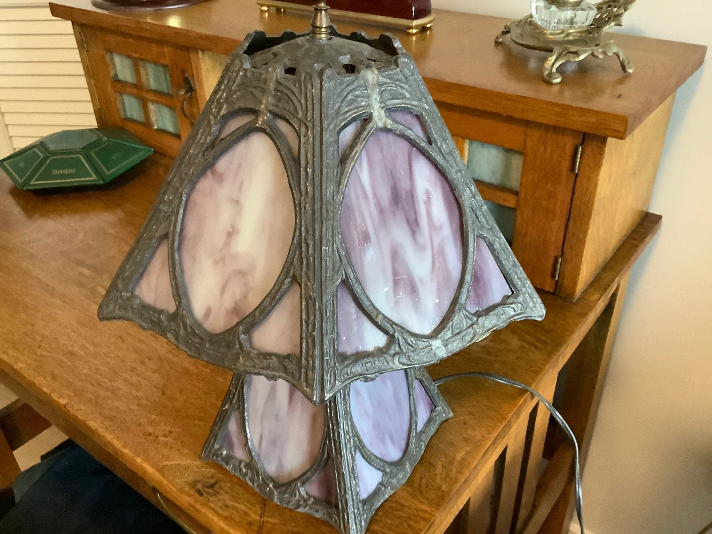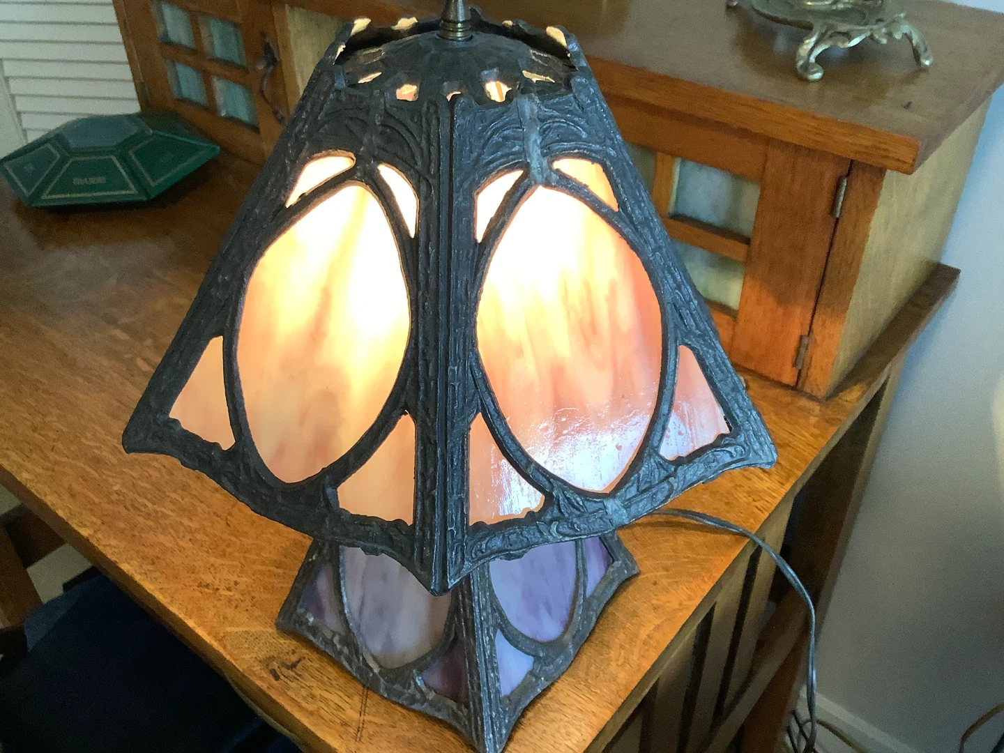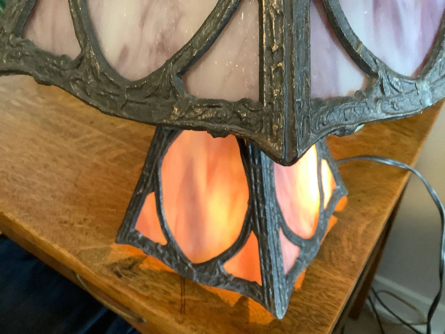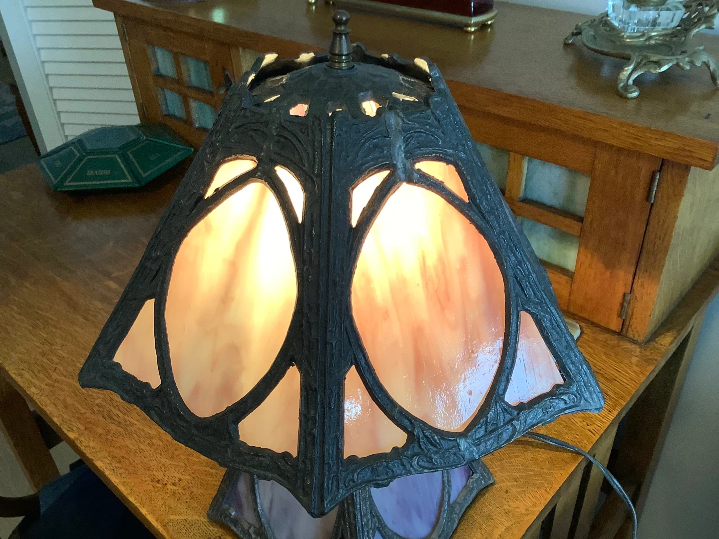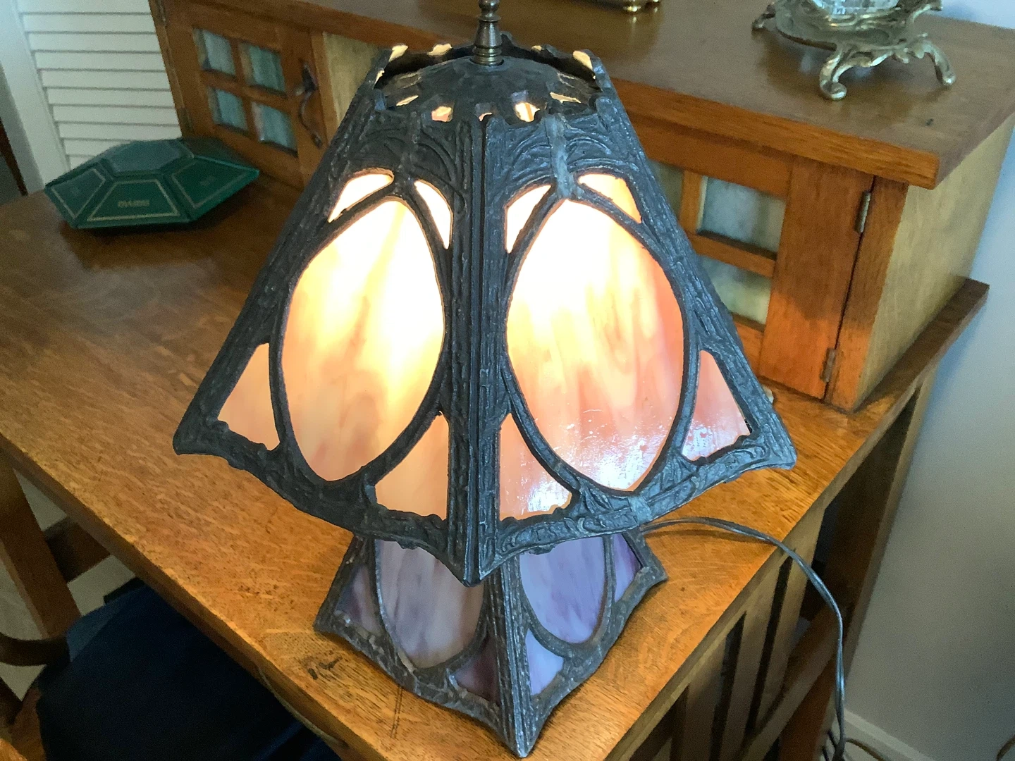 Art Nouveau six panel slag glass tri-light table lamp.