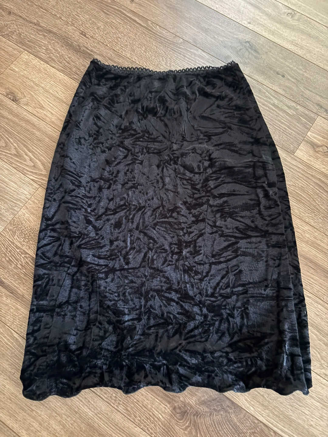 A lovely black velvet skirt. It's in great condition. The fabric has a nice texture and the skirt has a lace trim at the waist. Size is 5/6