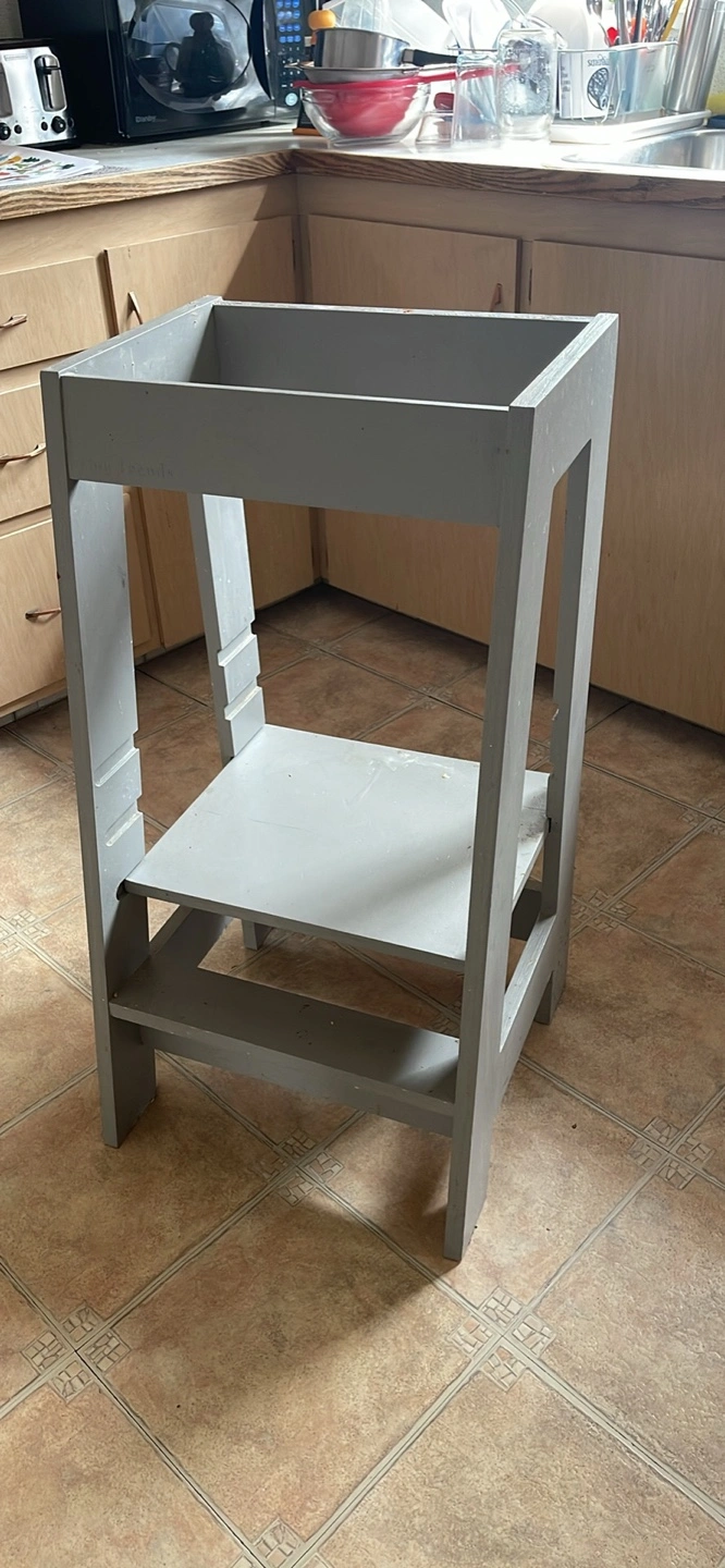 Grey wooden learning tower. Adjustable shelf for different heights!