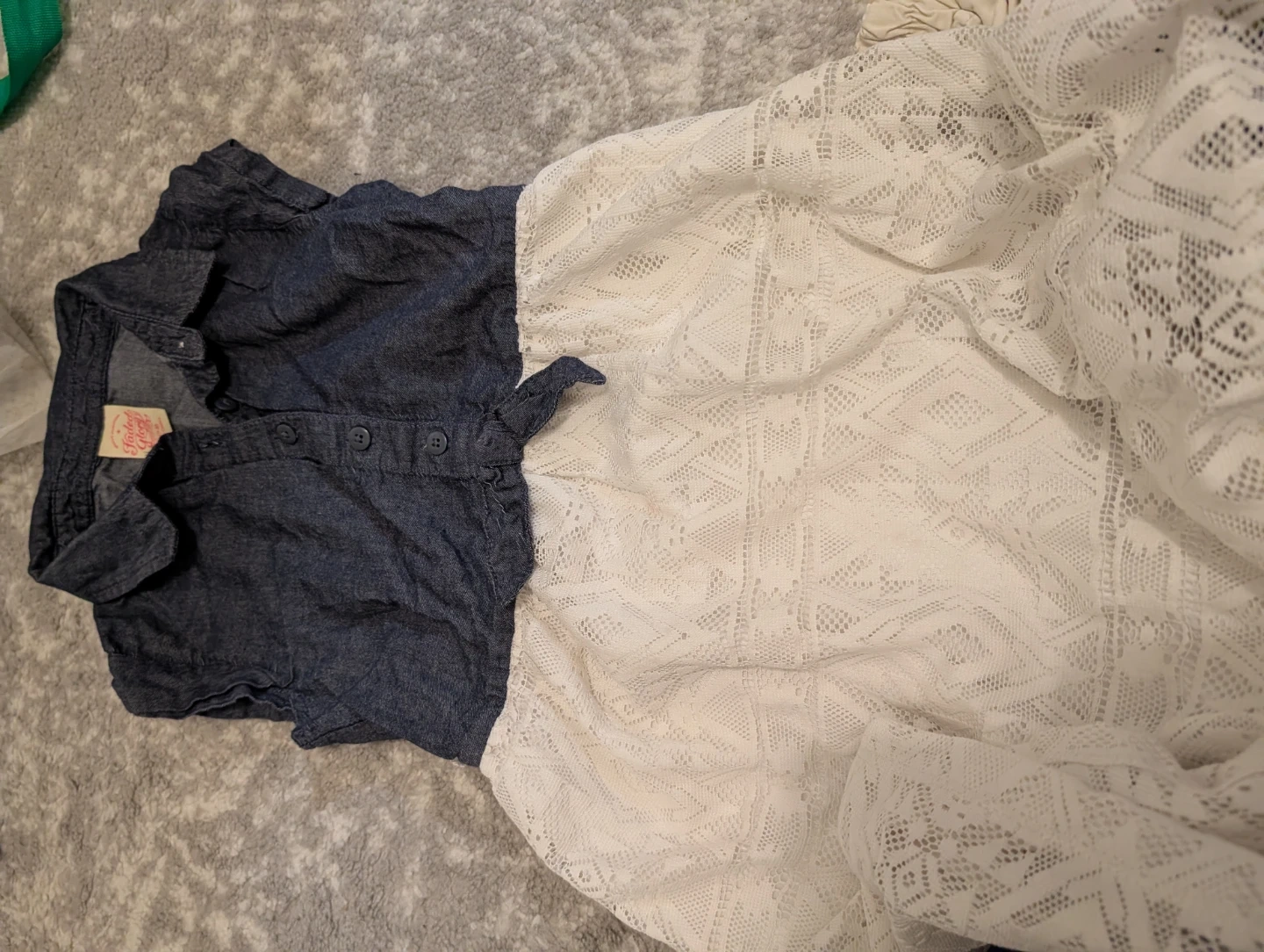 This is a Faded Glory denim and lace dress. The top part is dark blue denim with buttons. The skirt is white lace. It has a tie waist.7-8yπ