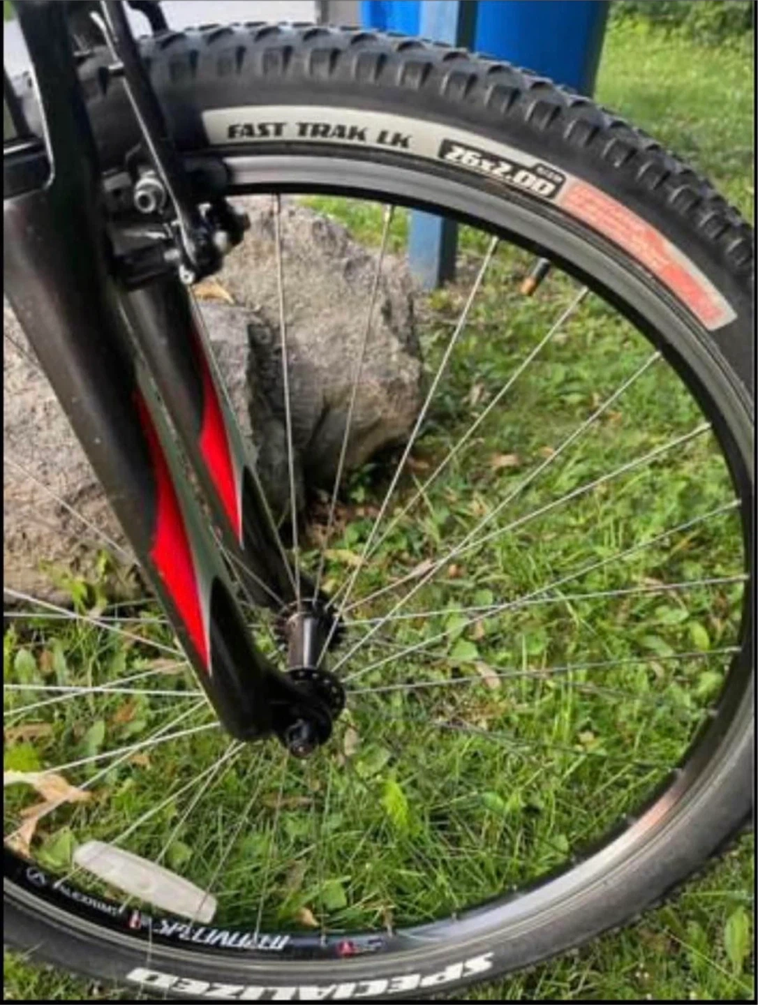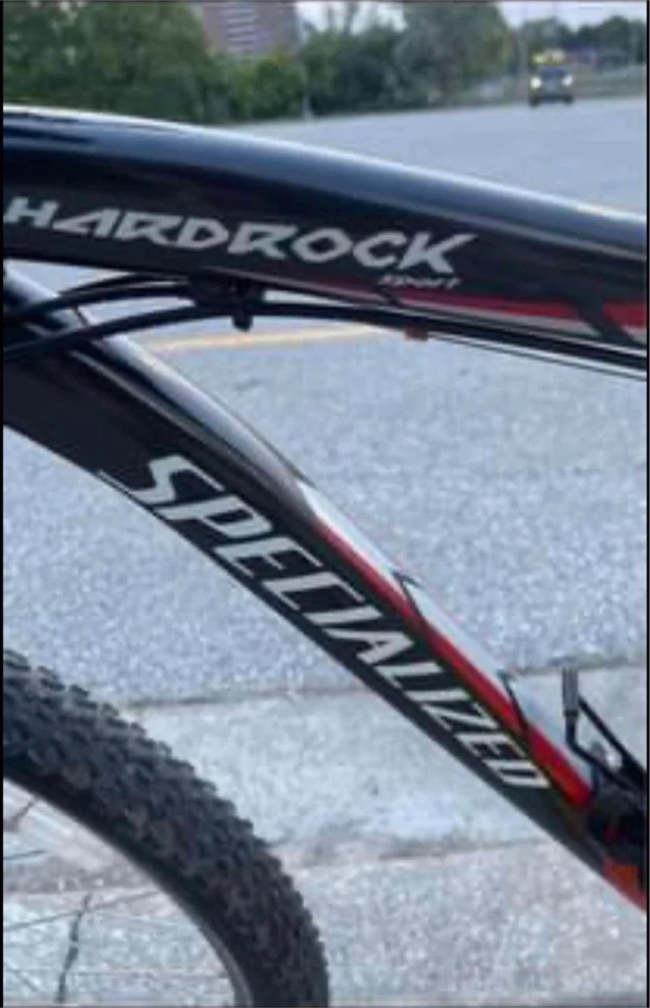 This is a Specialized Hardrock Sport mountain bike. It has a black frame with red and white accents. The tires are Specialized Fast Trak LK, size 26x2.00.