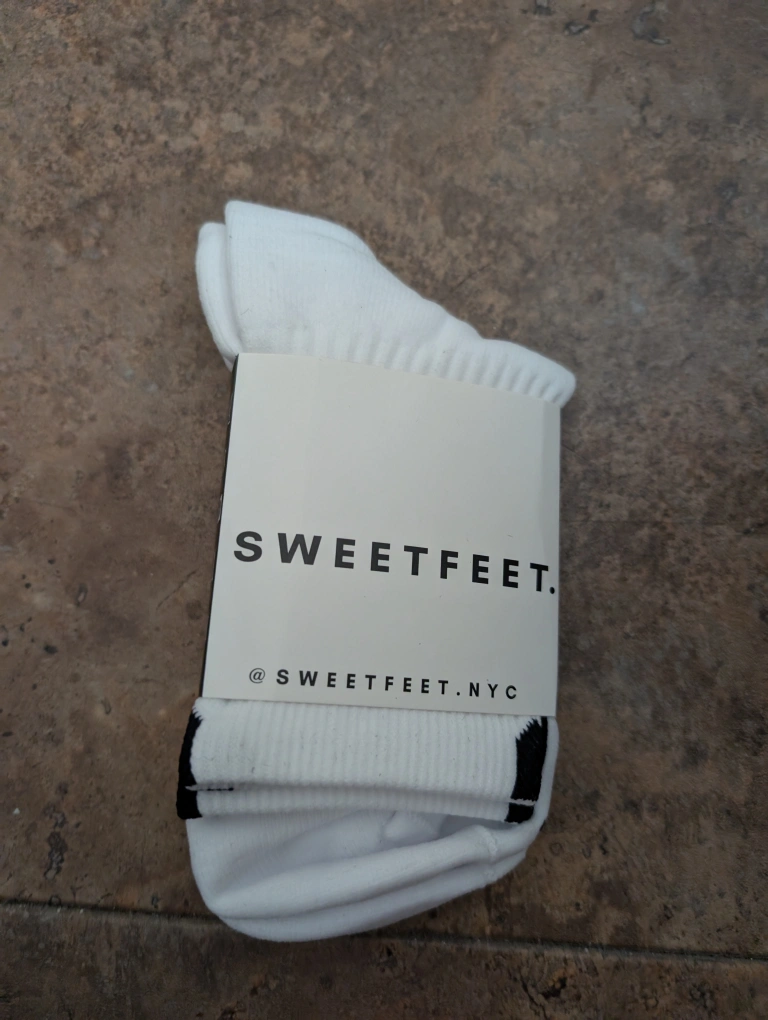 Selling a pair of Sweetfeet socks! They are white with black accents and size medium. The socks are new and ready for a new home.
